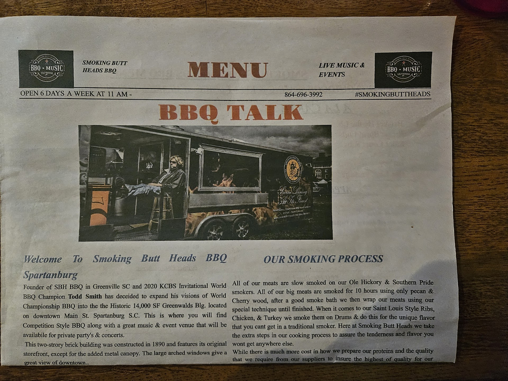Read more*Please Be Sure And Read All Negative Reviews For Thos Restaurant. Sunday 4:30pm. 3/2/25. Only four tables of people eating. Slim dark haired waitress, Bryn. We had to ask for a paper menu. She complied but said prices were incorrect on the paper menu. Correct prices on kiosk at table. As an older couple, it was hard to see in there and we didn't want to order like we were at home online. Used the flashlights on our phone. We ordered brisket and ribs plate with ff. 21.00. A pastrami sandwich (it comes with no sides) 15.75, a side of what we understood was baked beans, a side of macaroni and cheese, and a side of collard greens, 5.00 each. One sweet tea and one zero sugar coke, 3.09 each. Food came. There was more fat on the brisket than there was meat and it sure was small. And barely warm. The three small ribs were also barely warm. The hot sausage was warmer but very tiny. FFs were hot. The pastrami sandwich was warm and full of fat and hardly any meat, every bite had big chunks of fat. It was dripping in slaw that was nippy but entirely to much. The sides were pitiful. Hardly any in the already small bowls and at 5.00 extra each, they should have been very full and hot. They weren't. The macaroni and cheese was warm. The collards and beans were ice cold. When waitress finally came by our table, we told her. She asked if we wanted it heated up or replaced. Replace please, no restaurant should ever reheat. She brought them back at 14 minutes later and told us that the stove they were on was off on that end and the staff were not paying attention and they just turned it back on. Then she said sorry. OMG!! No telling how long they were sitting like that it must have been at least two hours for it to be that cold!! It can make us sick! They sides she brought back were steaming hot now. Microwave?? Re-boiled?? Don't know. The rest of our food was now very cold. We shouldn't have even eaten it. I hope neither of us gets sick. Those so called baked beans were actually a type of cowboy chili tasting thing with green chillies, bacon, and pieces of potatoes. Yuck. My husband and I couldn't eat that and had it removed from our bill. Our bill total was 59.29 after the removed beans. No manager came to speak with us, no discount, no offer to replace same meal at another time. Nothing. That is entirely too much money for what we paid for. We paid, left waitress a tip and as we were leaving, she asked us if we enjoyed everything and we told her NO and why. She said she understood and said for us to have a nice evening. We always support local business and local restaurants, but, we will not...