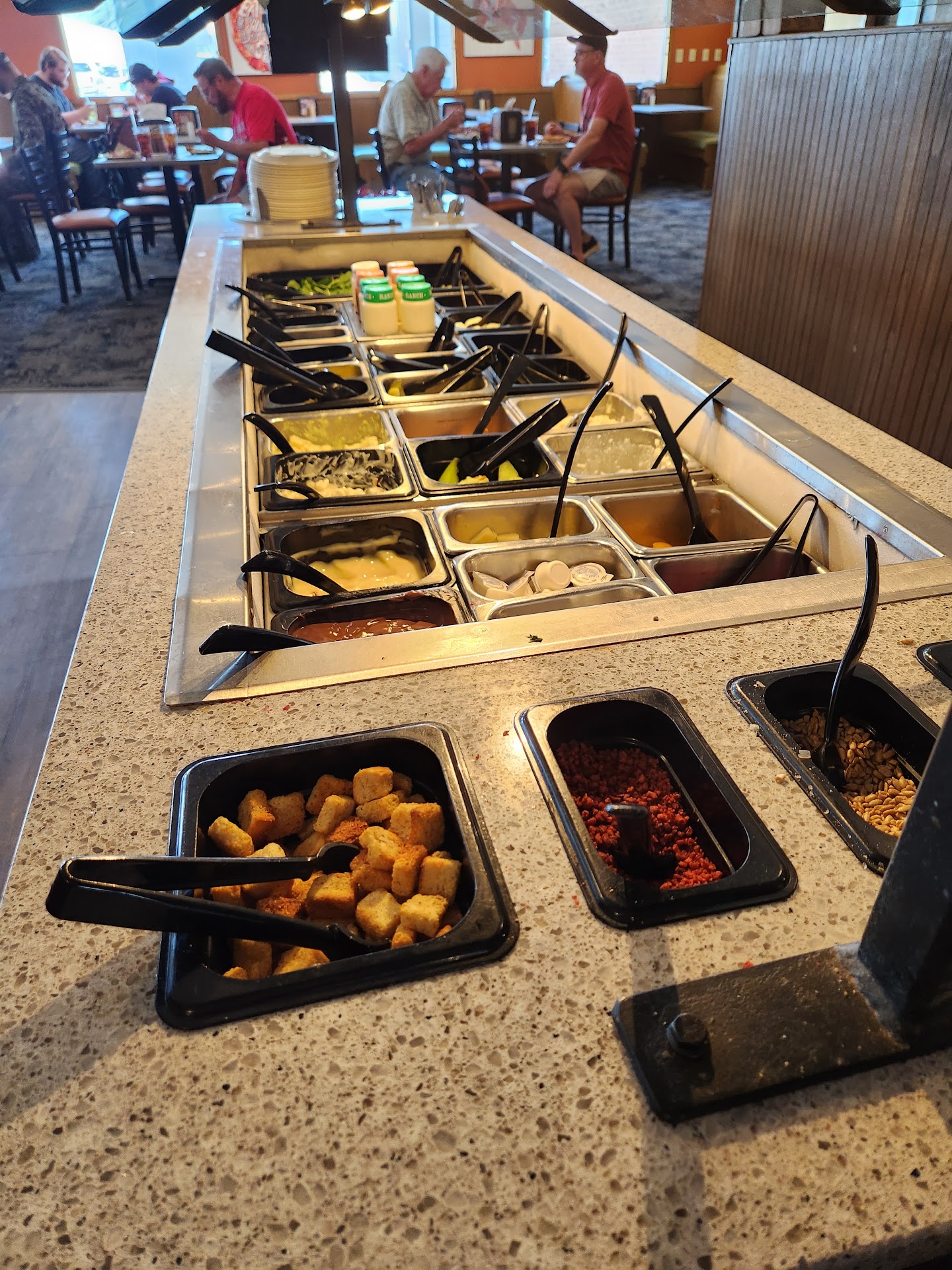 We eventually saw lettuce & chicken come out, which tasted good & got gobbled up quickly by those waiting. Only 1 pizza came out while we were there. The bright spot was a young lady working hard to keep "afloat".