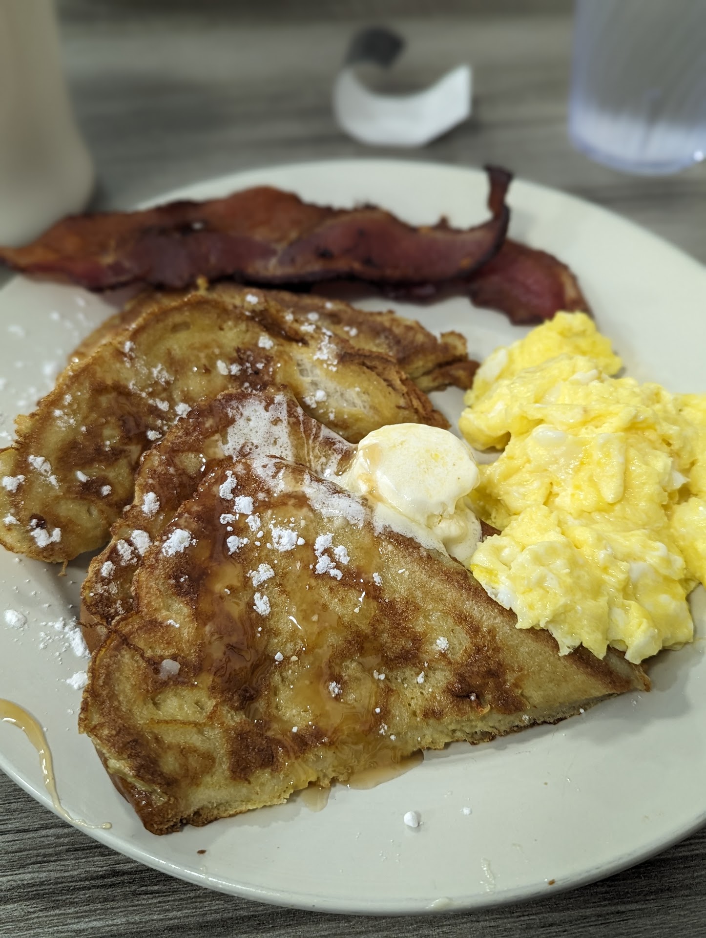Judging by other pictures on Google, the menu has changed slightly within the past 2 months, as I didn't see anything called SOS on our menu. I ordered the Crazy Rum French Toast, mostly for no other reason than because there wasn't a picture of it yet. In truth, I was having a very hard time deciding what I wanted to order because everything sounded very tempting. It came with two slices of French toast, two slices of bacon or sausage (I got bacon), and two eggs. Definitely enough to fill me up. My husband got the corned beef hash, and my daughter got the Simple Start. I only included a picture of mine since there are already pictures of the ones my family got, and they looked identical to the pictures you see posted.