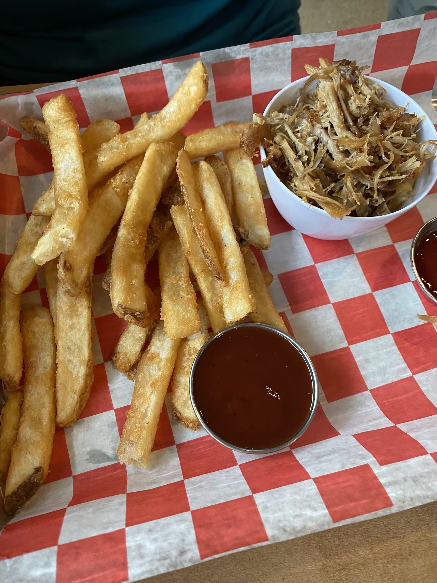 Let’s be real here fries are ready to be cooked out if the bag, but, this place claims they batter their fries with beer batter before cooking. They look and taste like regular steak fries.