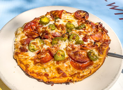 Hot Hawg -- Colorado Green Chili sauce, Canadian Bacon, Pepperoni, Andouille Sausage, Smoked Bacon & Jalapeños