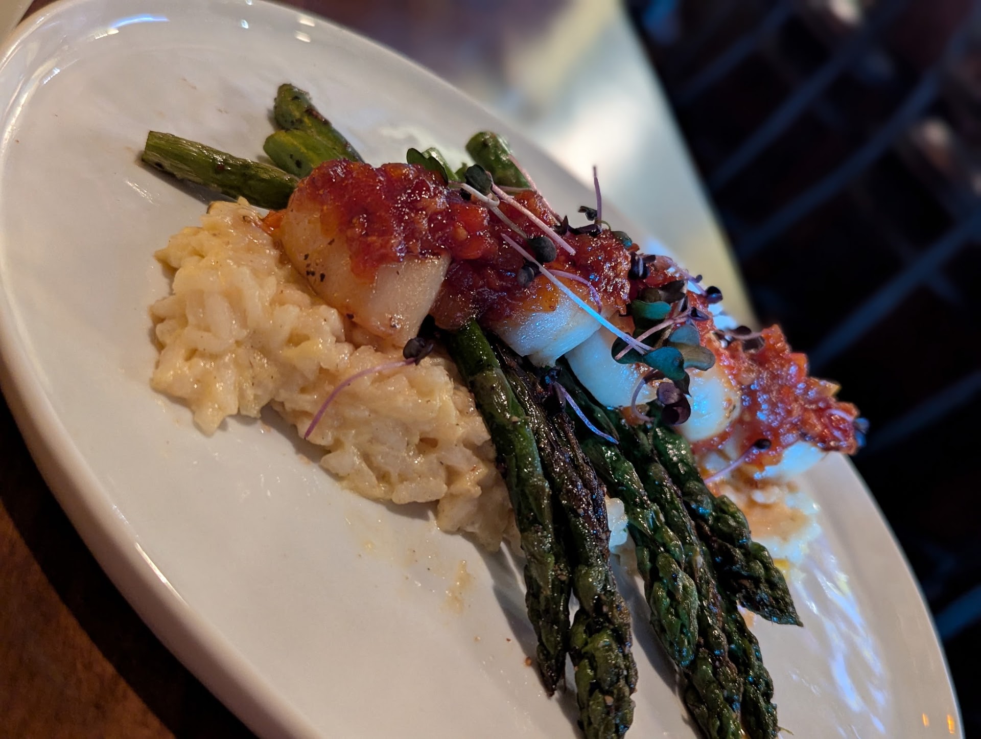 My wife got the dinner special which was Scallops with Bacon Jam served on asparagus and a sweet corn risotto. It was delicious. The bacon jam complimented the natural soft sweetness of the scallops and the asparagus and risotto were very well seasoned.