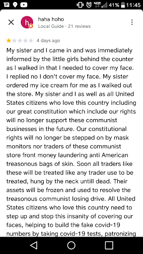Read moreHi there! This review is actually a response to someone else's review made 4 days ago. First of all, I thought it was common knowledge that wishing a violent death on a couple of teenagers was unacceptable in all circumstances, especially when they are simply trying to do their jobs and serve you. Second of all, if you feel this threatened by a small piece of fabric that covers your nose and mouth I suggest that you stay in your own home where you can spread your germs wherever you want. Maybe try that one ice cream in a bag recipe! Third, and this is just a logistical error, the phrase "communist businesses" is an oxymoron and by definition, no business can truly be communist. Lastly, maybe check a dictionary so that you can at least get your spelling right next time you write an angry review about an ice cream...