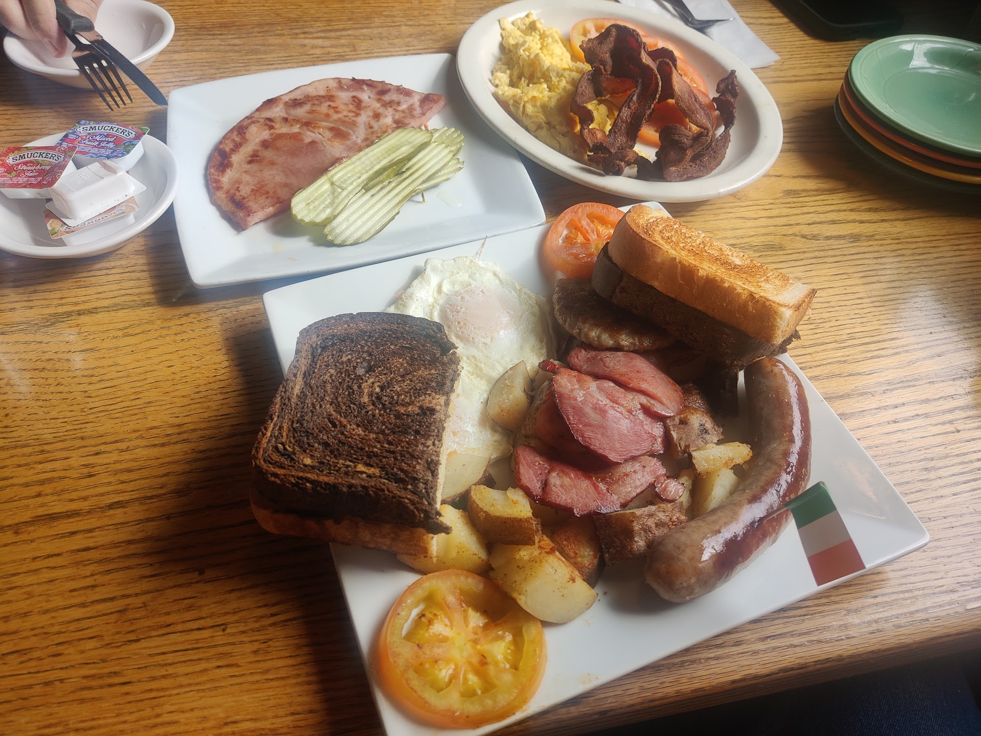 Now on to the food. We didn't realize you couldn't get breakfast all day (like at most places like this), so that was annoying to discover that breakfast had just ended when we showed up at 1:15 on a Saturday. The thing that really irritated me the most, even more than the abysmal service, was the menu. It has approximately 843 items on it. They do not offer one single item that is vegetarian-friendly, which in today's day and age is just absurd. You have burgers on the menu? Why don't you throw a box of veggie burgers in the freezer?