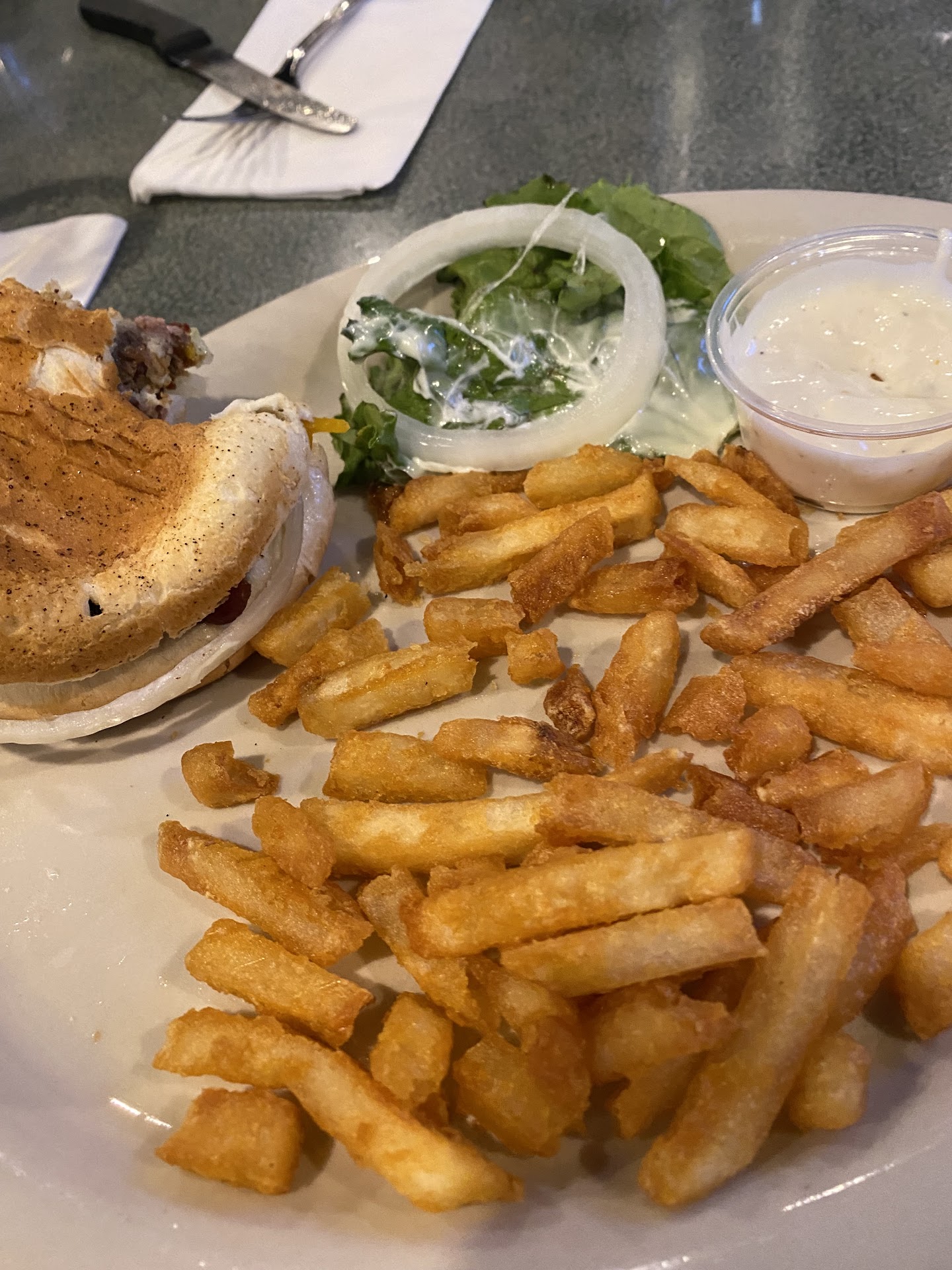Original review: Service was good and fast. Prices fair. Had bacon cheeseburgers and they were ok; except mostly rare or med rare at best. Now that may be ok if buying burger from a reliable source but when burger is a previously frozen patty from a large corporate supplier which buys mass produced meat, itâs a better idea to cook them to at least 160 degrees (no pink). Wasnât asked how I wanted burger cooked and I forgot to say. Waitress was great. Lettuce, tomato and onion on burger was fresh and good. Steak fries and crispy fries...