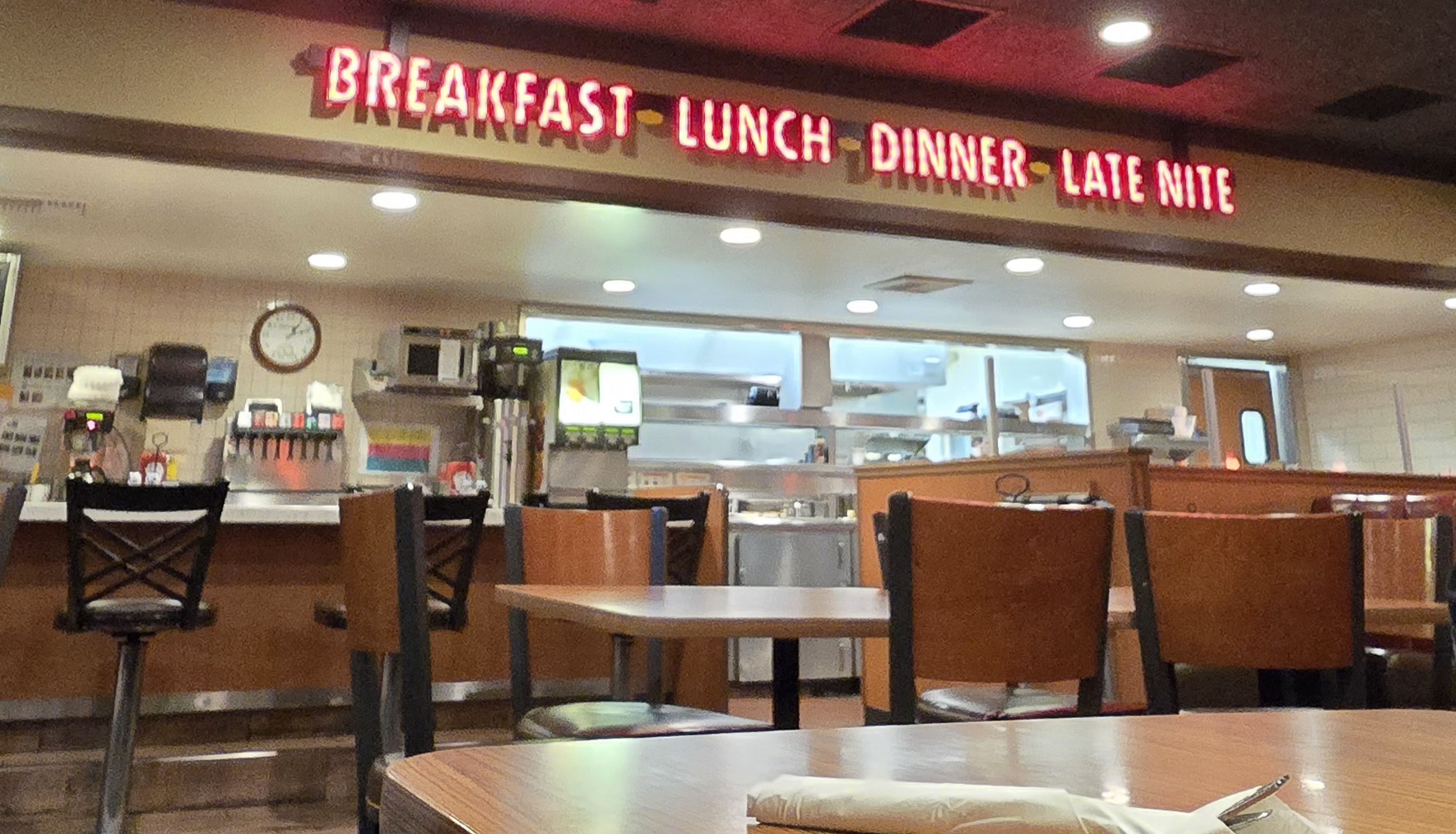After being seated in a nice quiet section, we were looking forward to ordering one of Denny's highly advertised meals. Evidently, several of those items are only sold during certain hours (11-11). Which seems very odd in a 24-hour establishment. Unaware of this, we were thinking, "thank God we arrived before the cut of time". About 15 min. before (22:45). However, by the time we were seated and finally waited on, there was only 1 min. before the cut-off and we were told those items were no longer available to order. Although that was a little frustrating, we thought, "ok, no big deal, we'll just choose something else."