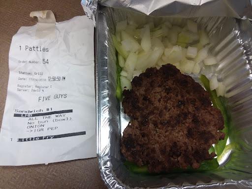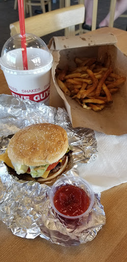 Went in for dinner gal at counter was friendly, I placed my order and waited awhile. I noticed the kid behind me in line received his order before me, no big deal he seemed to know some of the staff. I noticed how they sneakily didnt call out a number for his order. I wasn't in a rush so at the moment I didn't mind, approx. 4mins later I hear my number called and I get my food then drive home. As I sit down to eat, I bite down and find one of the two patties is medium rare, I set it aside and try my other cheeseburger to find both patties are rare. I ended up tossing the 2nd burger away and removing 1 of the 2 patties from the first just to have something to eat that night. There is a reason I drove 12mins, togo to 5guys rather then just walk the 5mins to a closer competitor, I like my burgers well done and 5guys is supposedly a place that "cooks all burgers well done and juicy" atleast that's what the signage in side says. In the end I spent $33.32, thats including the tip and essentially recieved 1 topless little cheese burger and a large fry... but hey atleast they didn't mess up the fries. I don't recommend eating here unless your dining in so you can make a stink when they F'up your order, just be prepared and bring in some wipes to clean off a table yourself as they don't often send someone out to...