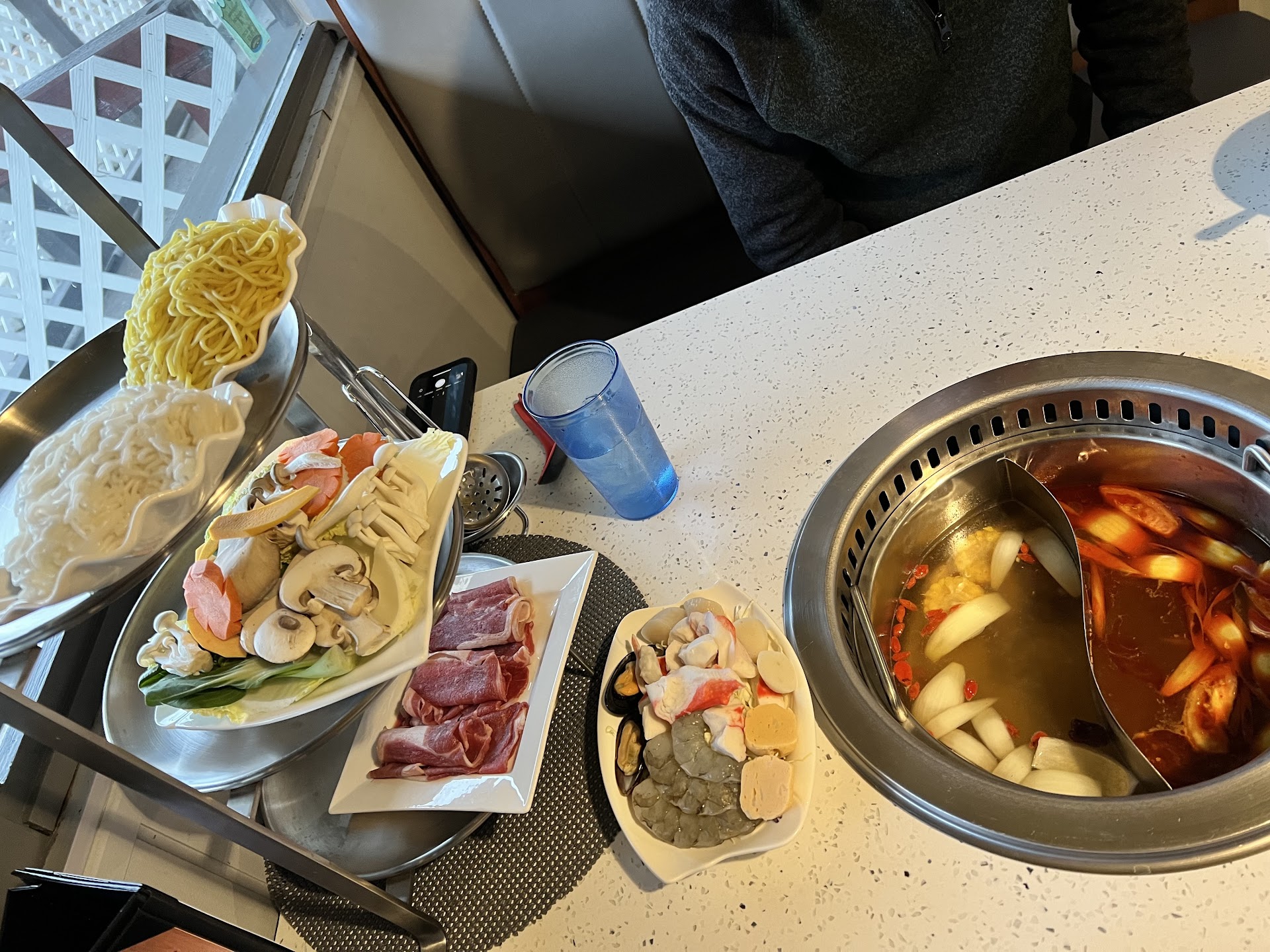 The gentleman greeting was so funny and personable. We enjoyed his banter and the way he presented the menu items - he also explained how the hot pot worked for my sister who had never been before (even repeated it multiple times 😂). The servers also checked on us constantly, we never went without a refill or napkins.