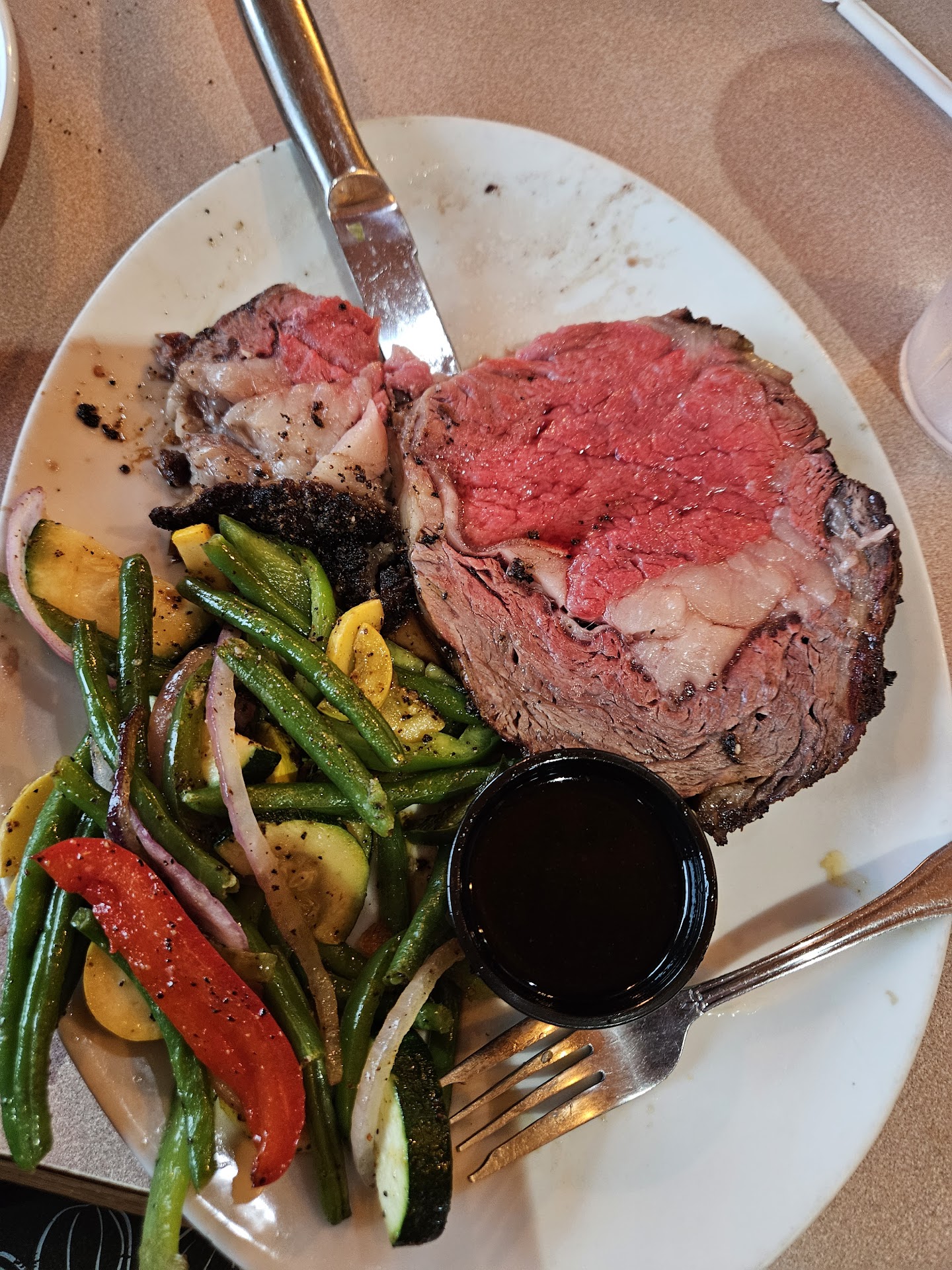The steak arrived on a pretty big plate with a baked potato on the other side. While I'm reasonably sure it was the correct size of steak ordered, I can't help but feel cheated because of the appearance of that little steak centered on the monster plate. A $25 steak and potato, paid an additional $3.50 for the up sell grilled mushrooms and onions,.. and there was still a lot of plate empty. Something about the presentation seemed really disappointing. (Just a thought, but would it really break the bank to toss something else on the plate to give the appearance that is a good value? Or perhaps elect to use a smaller plate.)