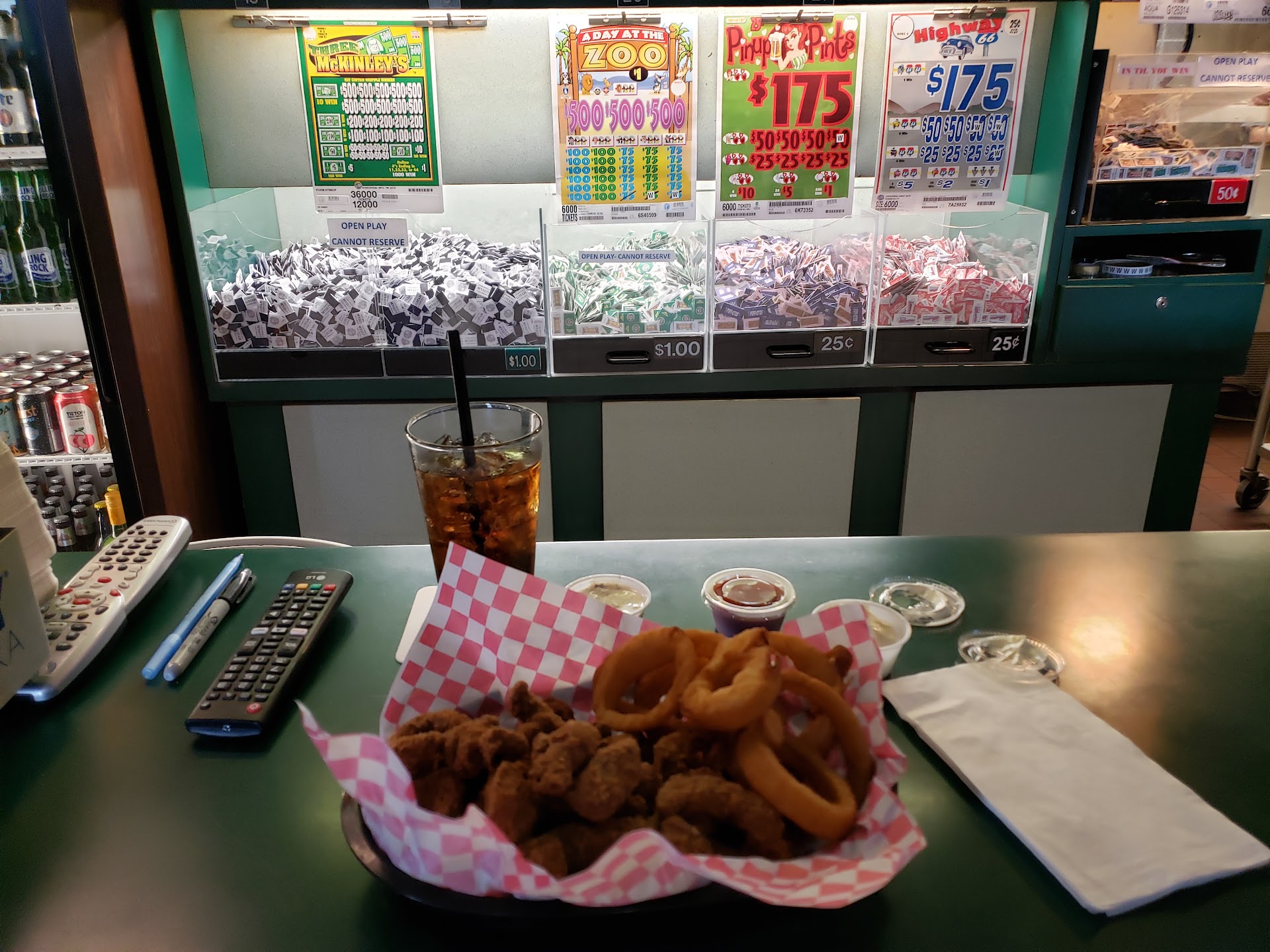 Ā Ā Ā Read moreI met friends here recently. After the bartender was finished with one of her (25 minute, possibly longer) smoke break(s), we were able to make order food and drinks at the counter. I asked the regulars if we had offended her & they shrugged and mentioned how she was overwhelmed with the 11-ish total in the bar. Each drink order was countered with a sigh & an eye roll. She seemed to treat the regulars the same as us rookies, so thereās something to be said about that. The good part is that the wings, mini corn dogs, and mozzarella sticks were good, when we finally got them. Drinks were okay. The best bartender can make any room wonderful, while a terrible bartender can turn a great place upside down. Thanks for the glaring hate with each of our orders. The green round table edge had duct tape residue that stuck to my shirt, which is a weird stain...