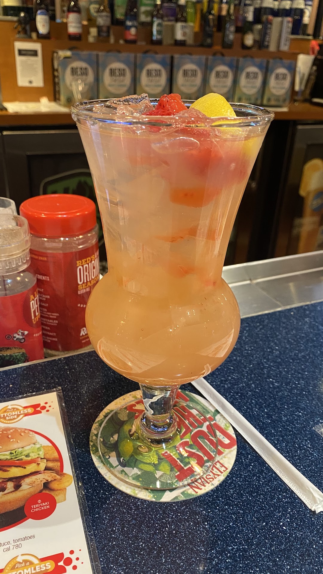 The first time we came to this establishment, we were very pleased. We sat at the bar and had 2 drinks each and dinner and the bartender that night was very nice. But when we went back on New Yearâs Eve, we had a completely different experience. The bartender took our IDs and she asked if she could keep mine. Thinking it was to have an ID at the bar, I let her. She then brought us back our IDâs with two cups of water and then asked if I had a debit card with the same name as my Driverâs License to prove I was who my ID said I was. So we went to our car to grab my debit card and came back to sit by our waters. We waited a good 10 minutes while this bartender was wiping off pickle jars behind the counter until a manager walked up to us and asked to verify my Driverâs License after she pointed us out. My debit card has my first name, middle initial, and last name on it and he said it checked out, while telling me in front of the bar that I shouldnât change my appearance from my Driverâs License photo. The picture on my Driverâs License was taken 4 YEARS ago and I was skinnier and had make up on. Iâve never had an issue using my state issued drivers license before. After he verified me, she came back to take our order. The clucks and fries I ordered were okay (even tho she brought me ranch when I said no sauce), but the problem came when we ordered drinks. We ordered the spiked Freckled Lemonades (which we had previously and liked), and when we got them, mine tasted like it had no alcohol in it, even though my boyfriend specifically mentioned we had vodka in ours the previous time. I tasted my boyfriends and his tasted like it had alcohol in it, but mine didnât. Another bartender saw me questioning my drink and brought me another one which DEFINITELY tasted like it had the alcohol in it. And after she took over the other bartender didnât come back except to ask us if everything was okay after the other bartender had already served us. If it wasnât for the second bartender the night probably would have been ruined. I believe itâs highly inappropriate to scold a customer about their ID photo when theyâve proven it rightfully belongs to them. The manager had mentioned while checking my drivers license that this had happened before due to the same issue (person gained weight since their ID picture was taken) and that personâs parents had cursed him out when it happened. So donât go to this Restraunt/bar if you have any change in appearance from your driverâs license or ID picture unless you want to be questioned/embarrassed in front of the entire bar. We probably wonât be returning due to this. Pictured is the drink I ordered that had NO alcohol in it because the bartender didnât agree/believe my ID...
