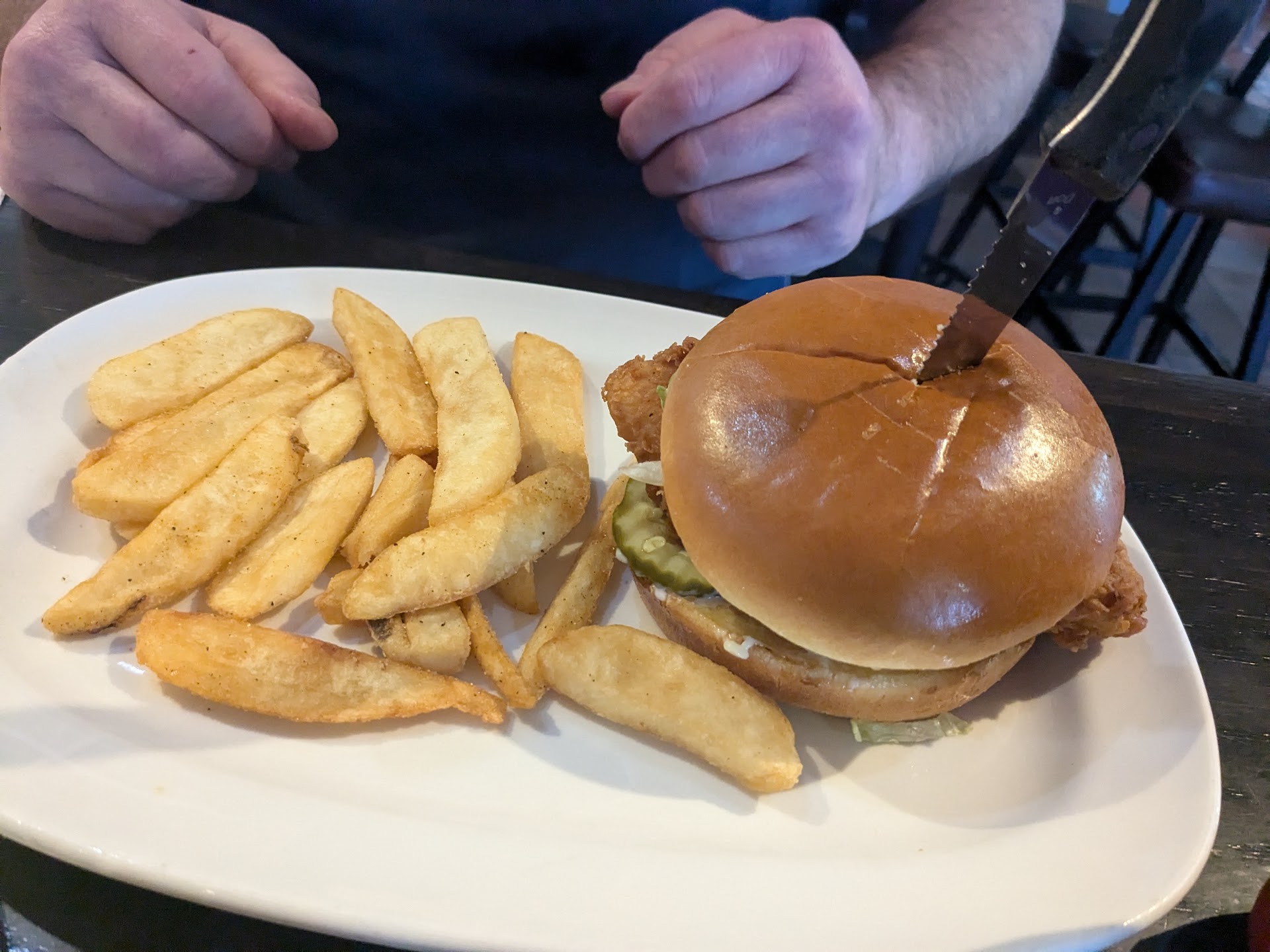 Read moreFirst off, our server was excellent. She kept checking in on us and kept our drinks full. It was honestly one of the best experiences we have had in years, at least until we got the food. We ordered a couple of appetizers to start. We got the large stack of onion rings. We noticed that it was missing an onion ring but we didn't say anything. Then both my wife and I bit into the first two on the stack and neither was fully cooked. As you can see in the picture, there was raw flower that looked like the oil hadn't gotten to. Disappointed, we didn't say anything and just threw the pieces in one of our baskets. Then we started to eat the fried pickles that we ordered. After we got through the top layer we noticed our basket was full of chunks of breading from the fryer and it seemed like maybe we got the last of the bag of fried pickles because there were just small pieces and incomplete chunks of them. Because of this we decided not to order any food and we paid and eventually left.
