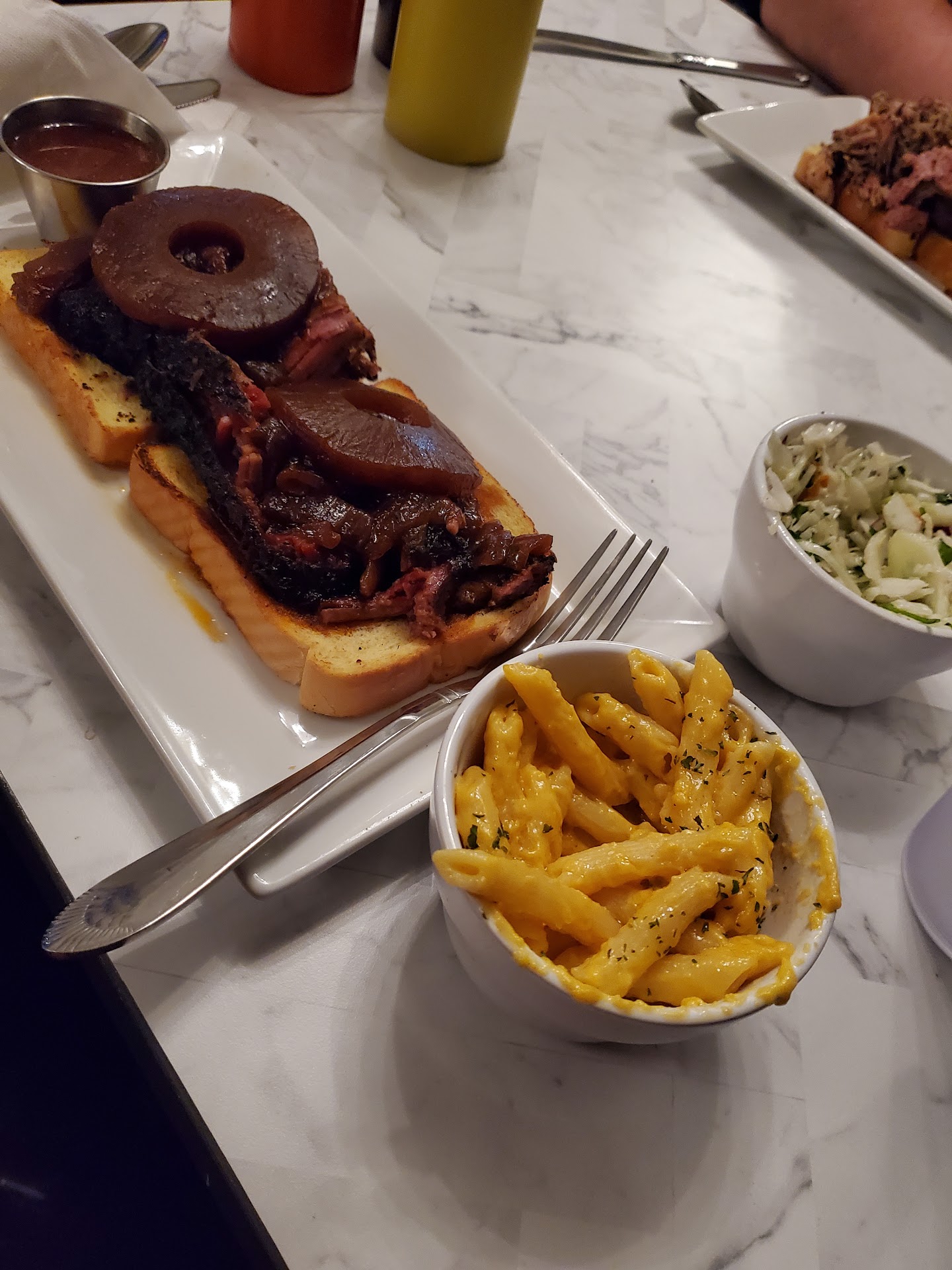Read morePretty good local BBQ place with a touch of class. The brisket was pretty good served on Texas toast on these nice rectangular plates, the dish that I had was called "Pineapple Express" which included 2 sides (I recommend their cilantro lime coleslaw!) And my other side was the 5 cheese jalapeño mac & cheese. The interior was nicely decorated and it has a nice touch to it (kind of felt like I should've worn a dress shirt with my slacks instead of my t-shirt once I was inside), the only thing I didn't like was the feeling of being too crowded and not enough space to move around comfortably since it's inside a train. I felt bad for the staff having to carry customer's trays filled with their food. Before your food comes out you are presented with 3 sauces, 2 of them a BBQ sauces, one "spicy" and one sweet and the other was some type of mustard (honey mustard?) which I didn't bother to try. All in all I thought it was pretty good BBQ and their prices...