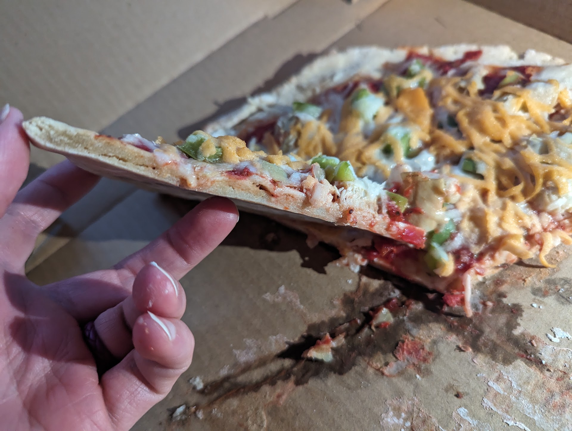 The pepperoni was awful, peel one off and you'll see the lack quality. Looks and taste like a slice of meat flavored soy, absolutely no crisp to it either. Just rubbery pepperoni on a soggy base.