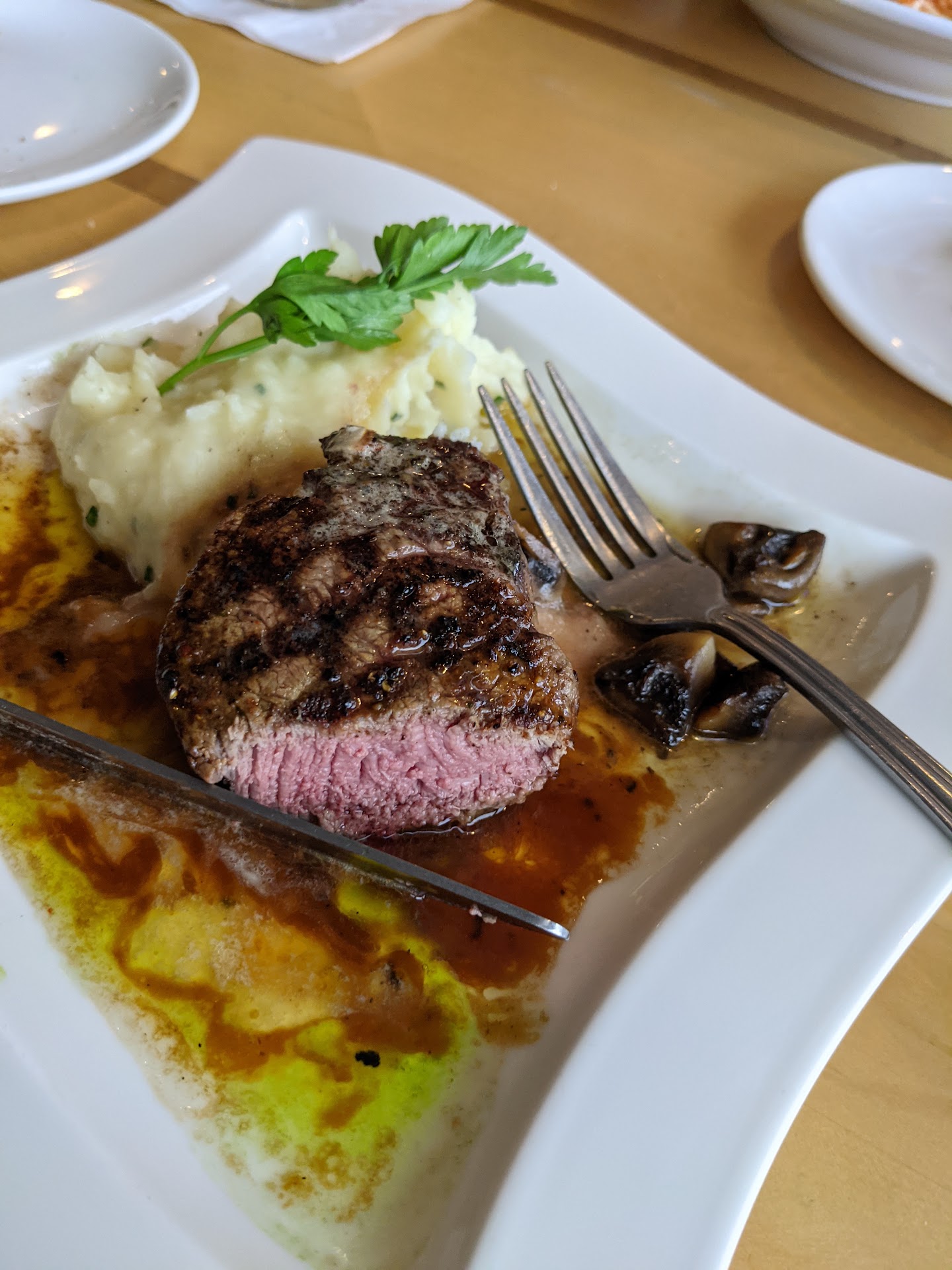 It's got a gorgeous view and a very accommodating staff. I ordered the most expensive of the three steaks they had after a friend was raving about it and I can only agree. This was by far the most impressive steak I've ever had. Not in size, coming in at around 6 oz. But what's there is worth every bit of the price of admission. The steak alone to die for and will elicit strong positive feelings every time I remember it for years to come. It came with mashed potatoes and green beans, but I have never been a fan of green beans. The waitress suggested roasted zucchini or roasted mushrooms to take their place. I chose the mushrooms And it was a wildly remarkable choice. Even my partner who has no positive feelings about mushrooms, was dying for more when I shared one of mine. The mushrooms by themselves, even as a simple dish, could hold their own as a delicious meal. Paired with the steak, I could not be happier. The mashed potatoes were very good. By themselves not the best I've ever had, but when given the chance to soak up the juices of the steak and mushrooms, they became a perfect pairing to the rest of the meal and I could not have chosen better myself.