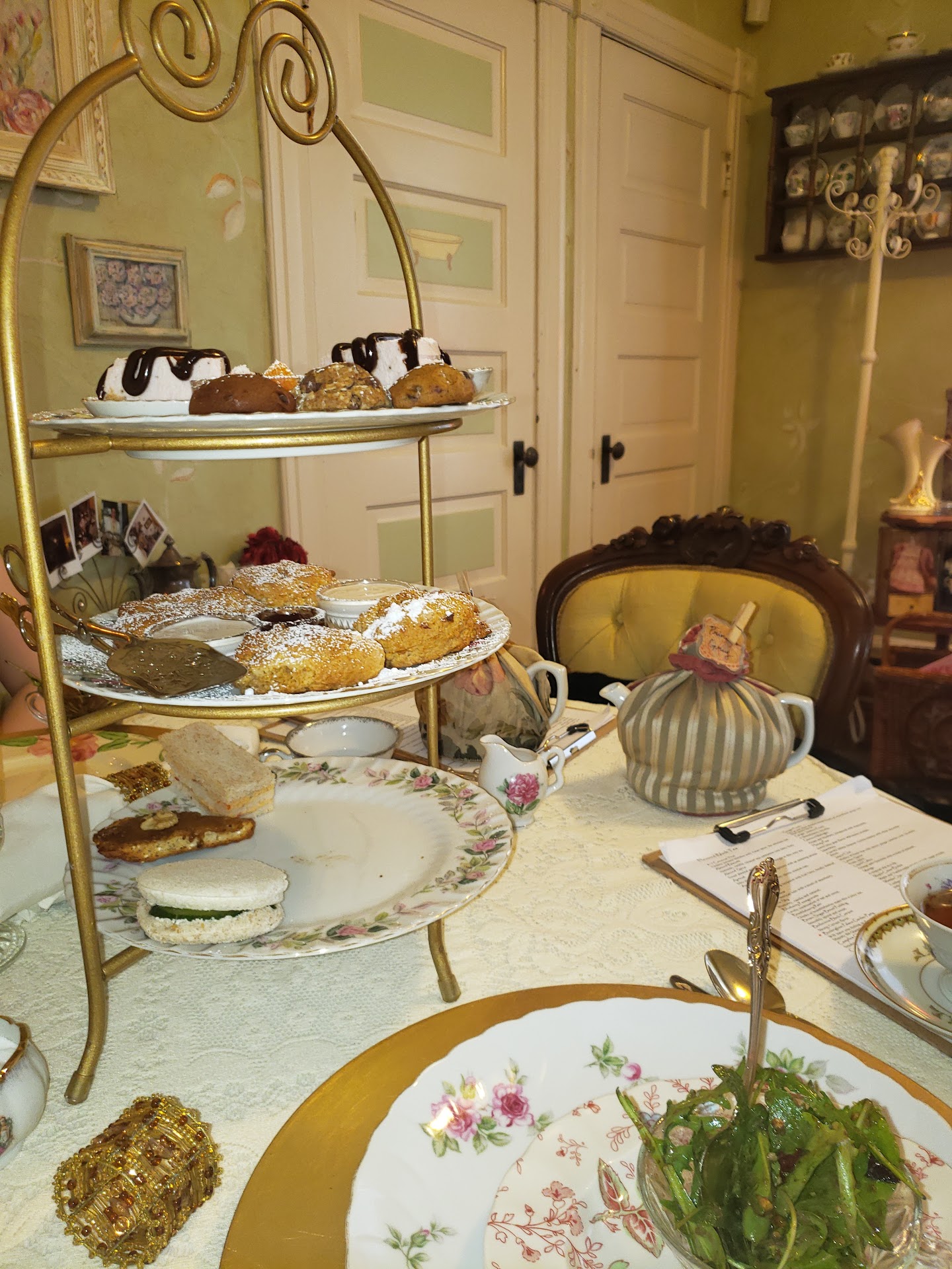 Read moreI was a bit apprehensive about going to a British/English tea house. I've only ever been to kissaten and chinese tea houses. The house itself is so stunning, it reminded me of my old work(historic plaster mason); they even kept the historical accuracy of painting the floors as opposed to staining them. The teas were very interesting, I got the ginger peach which was lovely for my tastes and the Jaipur which really didn't hit the right notes for my tastes. The three floral components were a bit too unharmonious in my opinion. The cakes and things were very good. I liked just about everything I ate with exception to the chocolate cake. It was perhaps too sweet for me? It was very interesting to get to try edible gold. Since I went for my birthday, I was very happy that they were so kind to light a little candle in the cake and did NOT sing to me. VERY thoughtful to an introvert! When we went to pay for the time, the attendant gave me the parting gift of some loose tea. I will 100% come back here and keep coming back, if for no other reason than to...