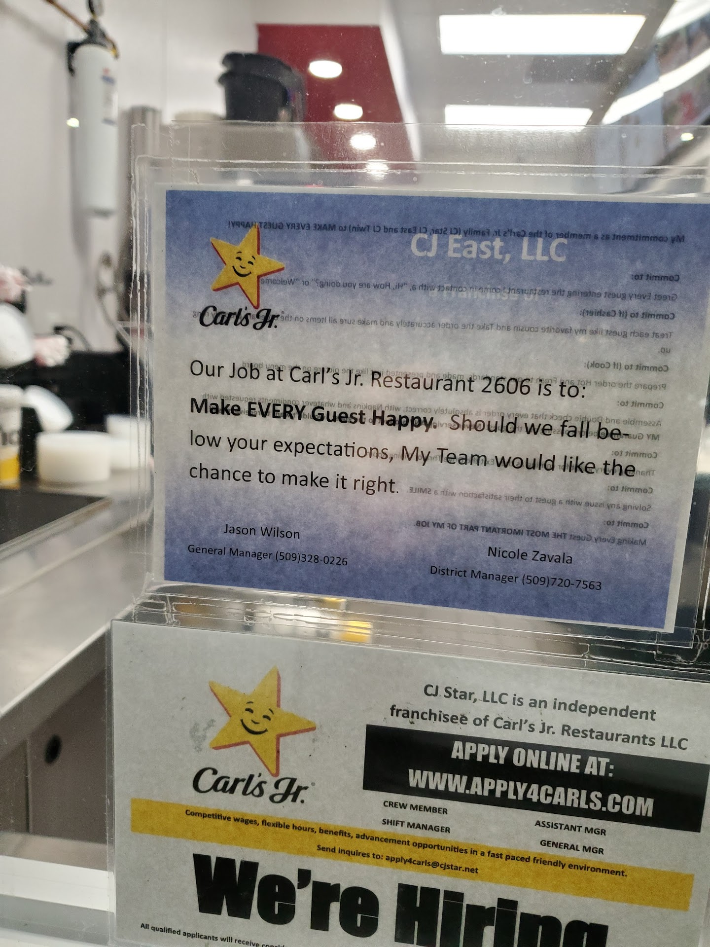 Mostly I wanted to write this review in regards to the poor employees working here. There were 2 newbies (Gloria and I think the other was named Tyler) they were the only 2 working this afternoon as well as a manager (from another Carl's Jr.) this was during lunch time and the drive thru was getting backed up due to the lack of available staff. It got to the point where they had to cancel people's orders as it was taking too long for them to get the food out. One customer went belligerent on Gloria and caused her to cry which made Tyler step in to defend her. After this customer from the drive thru took off a few other customers also verbally abused the poor staff and there was not manager from that location to defend them, the acting manager herself was too busy handling refunds to speak to the screaming customers. After everything died down, a fourth employee had been called in to help out and everything seemed to finally settle down. I hope that the employees receive no repercussions for the way they handled their abusive customers and I hope that the actual manager of this restaurant is given disciplinary action for leaving 2 newbies and an untrained manager alone during...