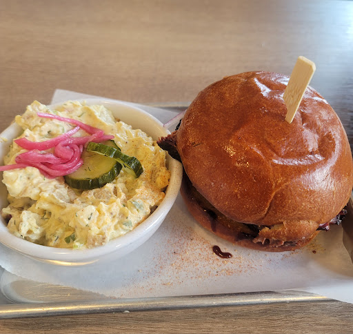 This is a fairly new boutique restaurant having opened in July 2023. The atmosphere is a little hipster, sharing space with a brewery and coffee shop. Orders are taken at the counter but there is table service after your order is placed. The staff are very friendly. We mentioned we were killing time while waiting on our dog's grooming appointment. The staff provided a little packet of smoked turkey for our dog when they served our food, which was such a thoughtful personal touch. Turkey BLT - thick slices of smoked turkey, tomato, and bacon served on an artisan bun. It was a good sandwich. Very filling and they were liberal with the turkey, bacon, tomato and lettuce. The turkey had a really nice flavor. I would have liked more of the herb mayo. Potato salad I chose as my side was amazing and creative. Not sure what was in it, but I would definitely order it again. The pickles were really good as well. They had just the right amount of sweetness to them and could taste a little dill in them as well. Dang Burger - The pimento cheese and fry sauce added a unique flavor to the juicy beef patty. The fry sauce was also a creative blend that made it special and delicious. They could bottle it and sell it! The fries were seasoned well. We will be patronizing this restaurant again to try their...