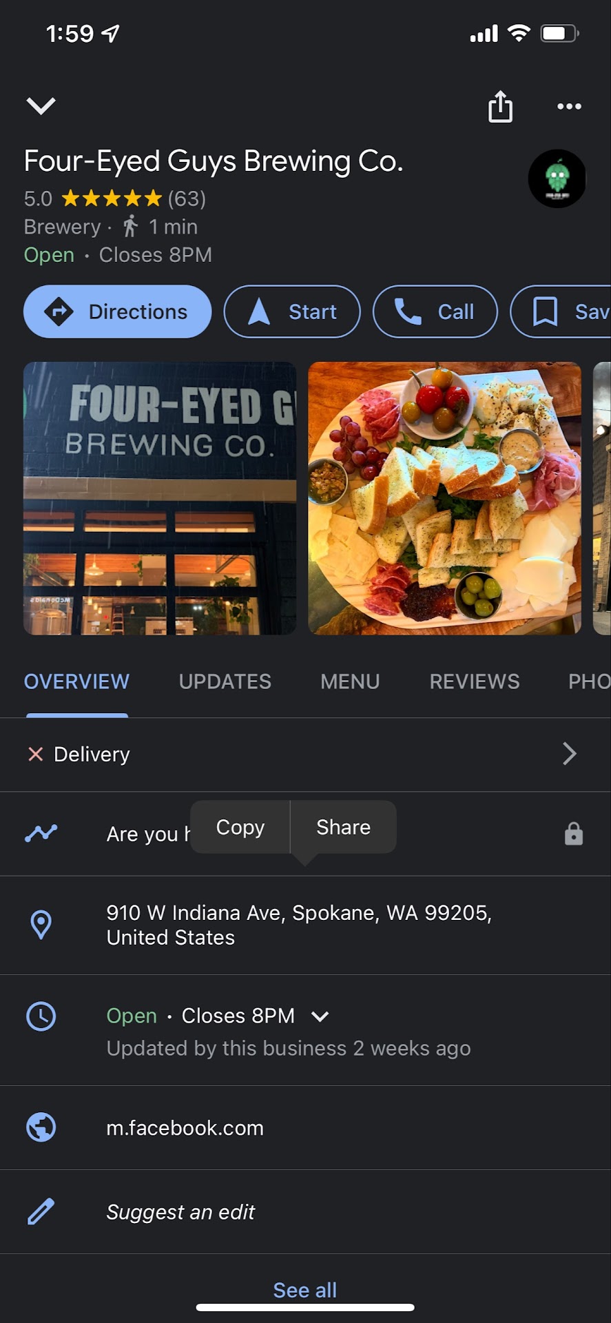 I was looking for coffee, or a brewery, or both. I was en-route to a different brewery, and saw Four Eyed Guys - a convenient development on my drive. I pulled in, sat down, ordered a Winter Pines D(double)IPA from Alex, one of the owners. It was delicious (and I took my time drinking it, too). I was a few sips in when Hillary, the other owner, and coincidentally, married to Alex, asked me if I would like something to eat. I told her that I wasn’t really hungry. Hillary, chock-full of vitality and a very clear zest for life, has enough energy to power a small city. The word “persuasive” in the dictionary should have a small picture of her next to it. Anyway, somewhere in a pleasant discussion I ordered a charcuterie plate - a large one. It was as big as an extra—large pizza. Delicious! Arugula, copicola and prosciutto (I think), goat and two other types of cheese, a very tasty jam, mustard, and a small side of something that tasted incredible. I could not figure out what it was, so I asked and it turned out it was artichoke. Macerated, I believe that was what Alex told me. Who’da guessed that. I could of eaten a plate of that, alone. It was good, very good. The interior is unpretentious and comfortable. The choice of music is great, and somehow, they found that sweet spot between too loud, and not loud enough. It’s easy to carry a comfortable conversation. So, too, are the furnishings. Comfortable. Whether you come alone, or with friends, the sum of the parts creates a greater whole, and it would be easy to spend hours here without knowing it. A couple of hours passed, and I had no idea.