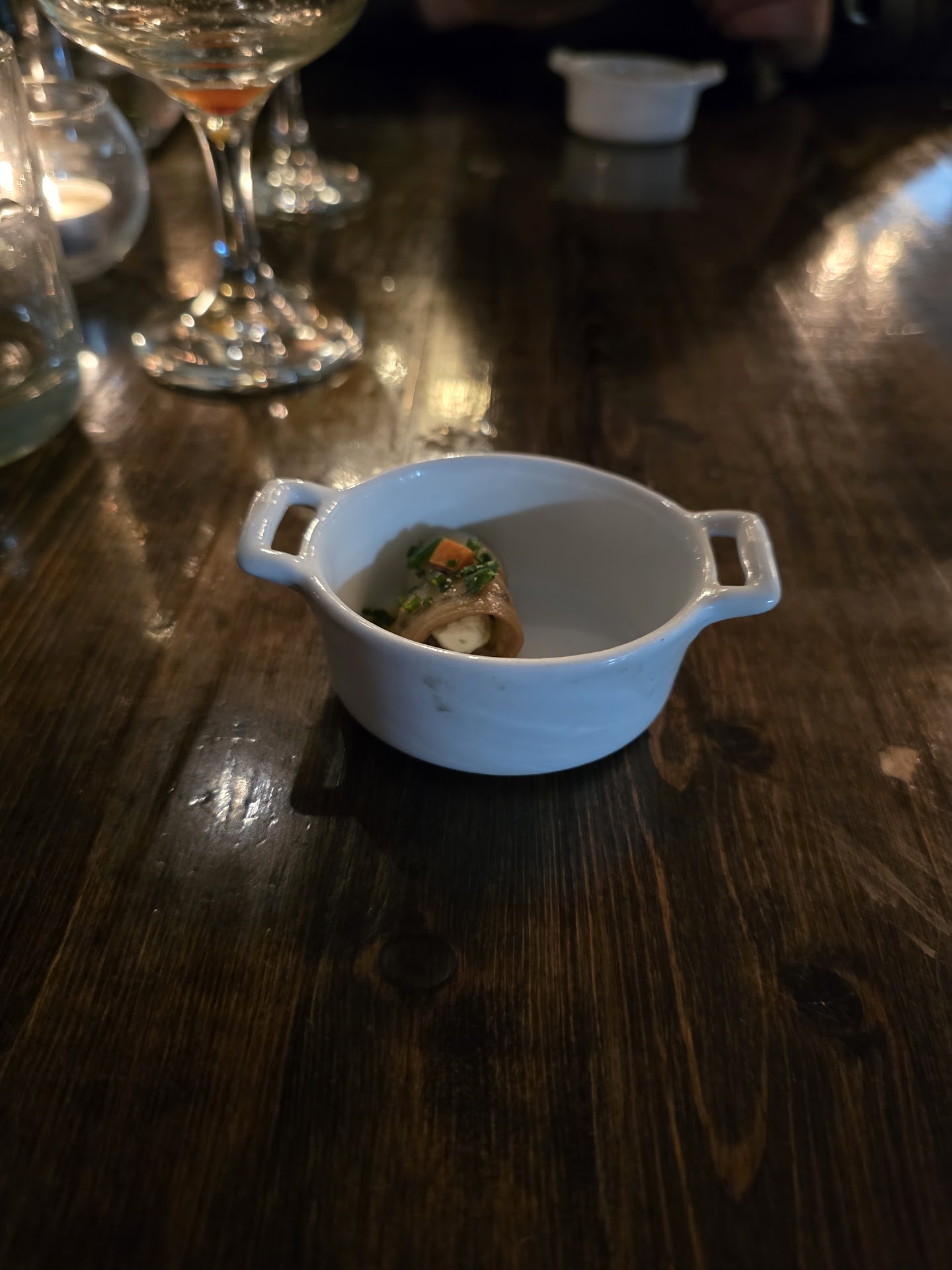 The food had peaks and troughs of quality. I loved the small bites, especially a bread service with chive butter. The cocktail menu is also excellent--much of the mixers they make in house, and the quality and nuance were apparent.