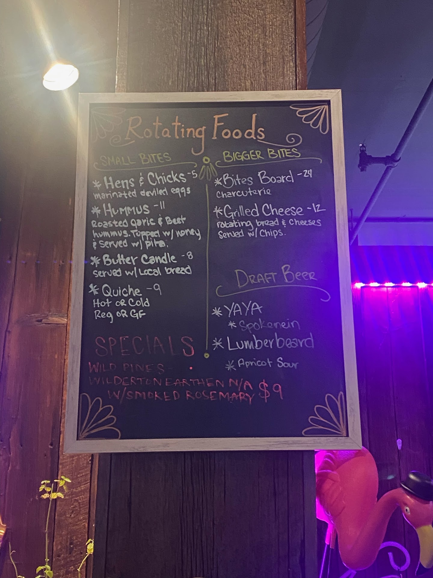 The food really needs help- the flavors are there but the menus and listing ingredients leaves a lot to be desired. Iâve seen them post amazing rotating menus but was personally disappointed when me and my sisters decided to go there really was just not the variety or exciting things I had seen in posts. Also, nothing that wasnât basically a snack. We couldnât eat dinner so to speak. We did get a charcuterie board that had some good flavored things (maple bacon jam and smoked Gouda) but for $24 it also had bologna and very basic crackers. Also, a bummer nothing was labeled on the menu as far as what it came with or labeled when it arrived so we were left guessing what everything was. My group ended up leaving to get âreal foodâ and returning for more drinks afterward.