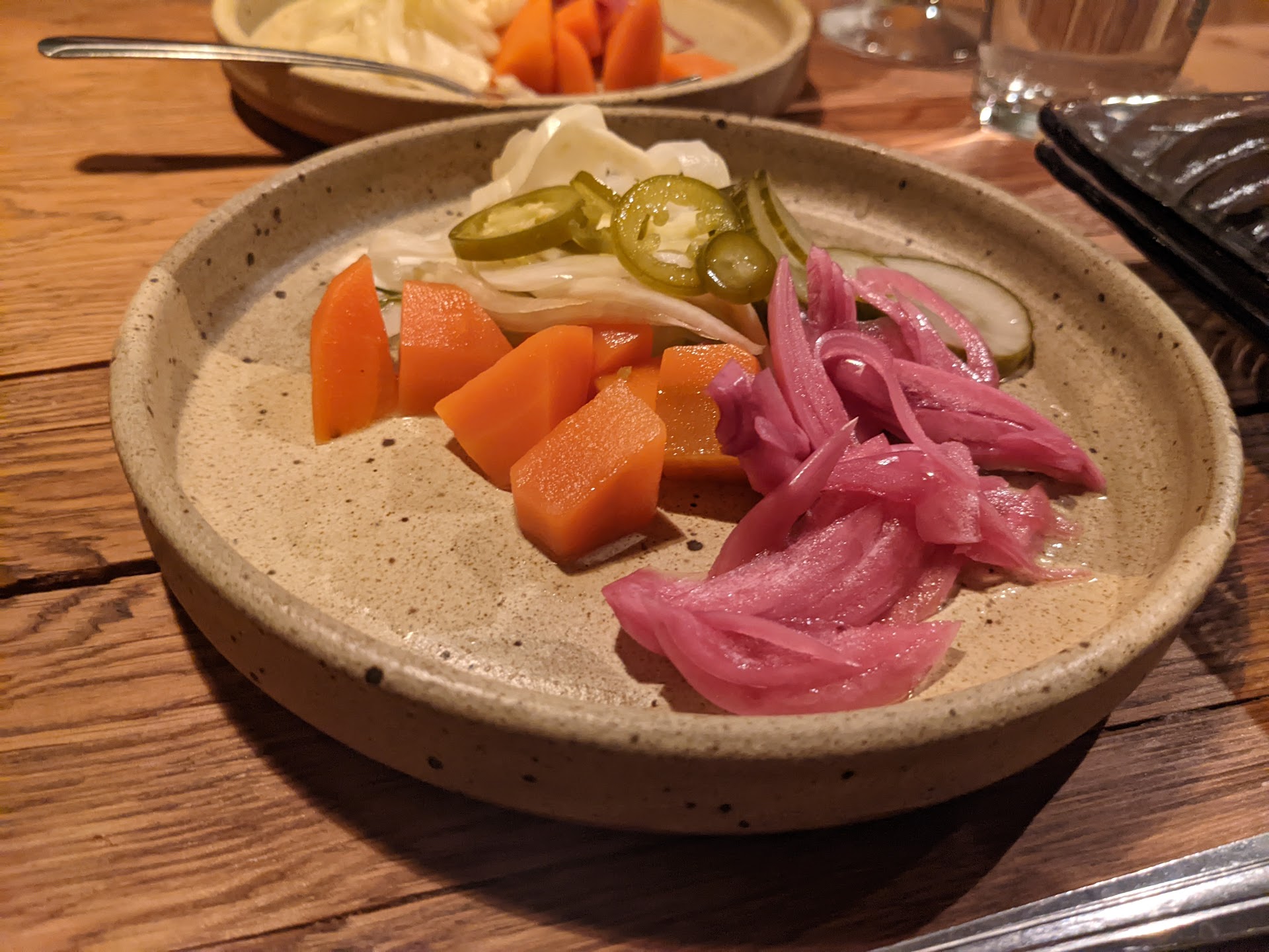 For appetizers my wife and I got pickle plates off the happy hour menu, we saw them go out to another table and they weren't that large, and both of us love pickles so we didn't want to share. But this item is a must.