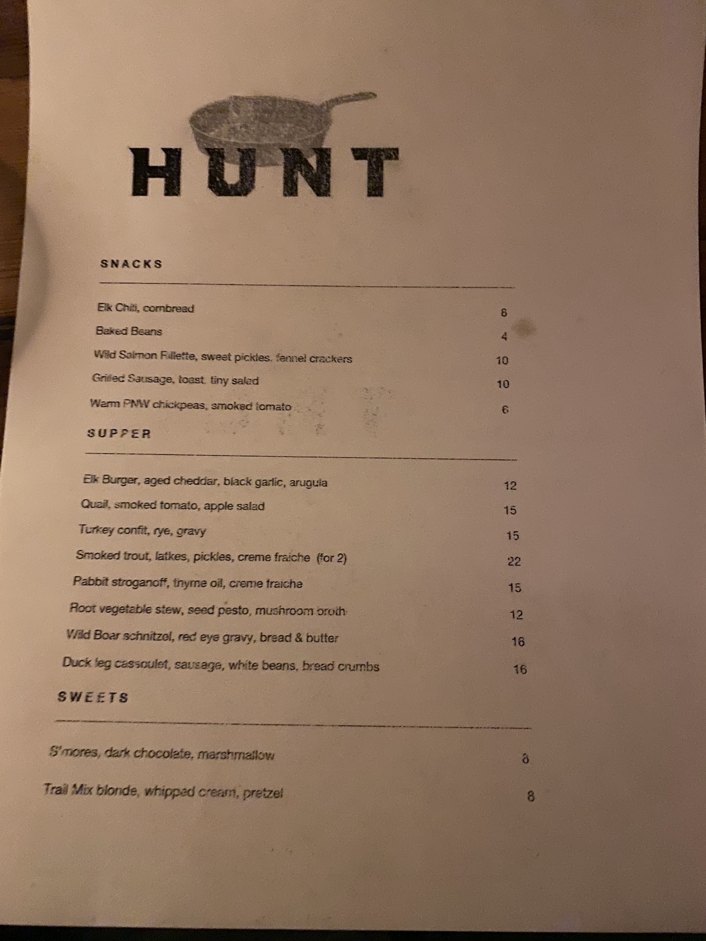 Read moreWe were very excited to try Hunt. Atmosphere is very cool, uncomfortable stools bolted to the ground are not. The menu looked delicious and we were hungry. A waiter arrived at our table with the wrong food and when we declined it, he said, must be the wrong table, didn’t look at the ticket. Okay, no problem, right? When our food came, one of the plates was wrong, even though the waitress said what was ordered. When we pointed out it was wrong, she was like, SO. And just stared at us. Two more times she was told it was the incorrect dish and she didn’t move, finally we relented and took what she brought. Food was good. My husbands meatloaf was delicious!!!! At the send of the meal, 1 check was brought for 4 people. We were together at a table, but arrived separately and one couple ordered drinks and an appetizer before we even arrived. We asked for a two checks and she said she would split if we gave her two credit cards. When we wanted to pay cash, she said she didn’t have enough money to take cash. What??!!! Finally, two checks arrive and guess what, split down the middle. We’d had enough! We paid and left. The atmosphere is cool, the food is good, and our waitress was bad....