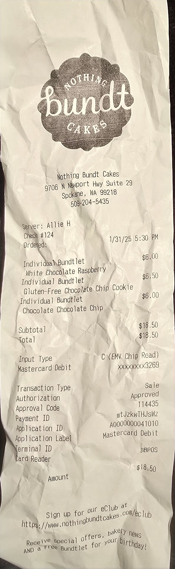 Original review: Hello, I have purchased 3 cakes at the north spokane Nothing Bundt Cakes Location on 1/31/2025, I had purchased them around 5:30PM and had picked up my girlfriend and ate them at 7:15PM. When I started to eat my White Chocolate Raspberry Cake I got half way when I took a bite of a hair. My girlfriend said "Must be mine lol" until I took another bite of the far end in the pictures and then ate MULTIPLE hairs, 3 in total. I don't want to eat the rest of this as it is very unpleasant to find hair in my cake and I am certain it is the cake makers that this hair has fallen from. It does not match my girlfriend and it was a lot baked into the bottom of the cake. I am requesting something to be done to reconcile...