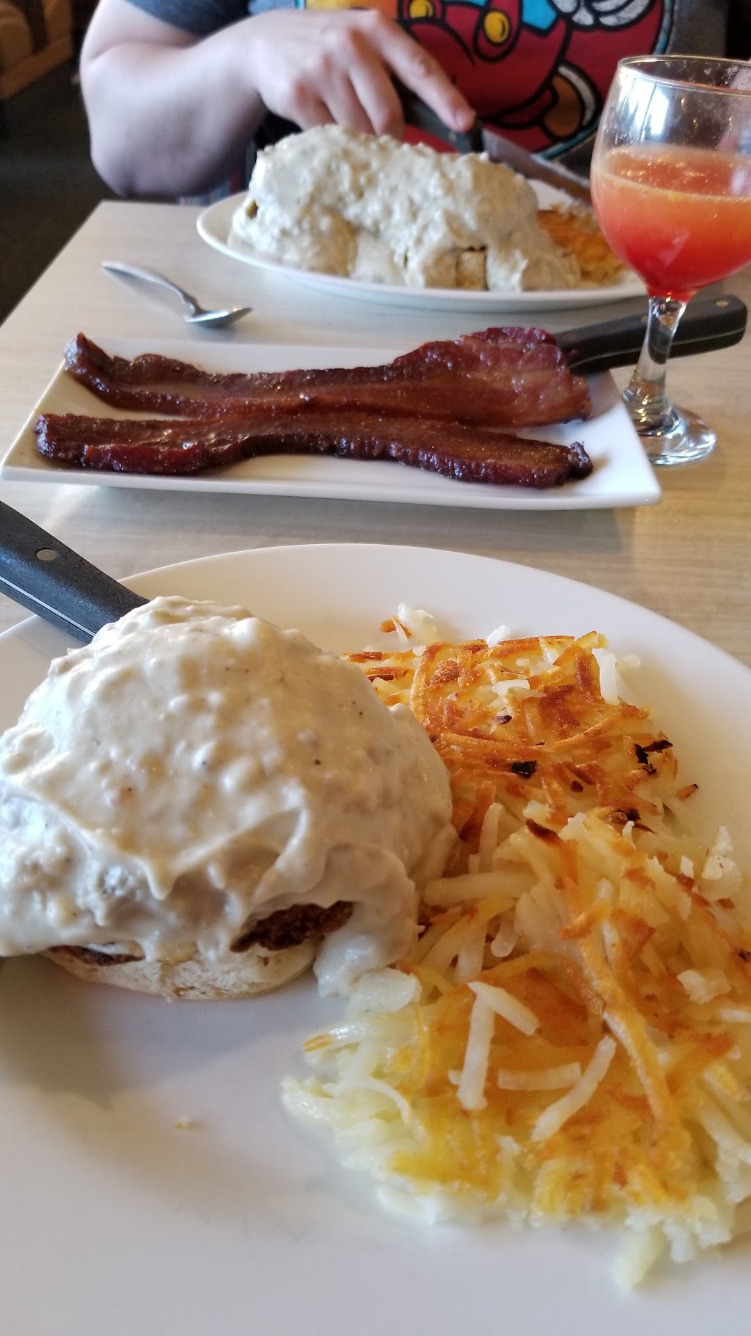 I'm giving this establishment a 1 star review and only because the waiter and the bloody Mary deserves a five star. The restaurant was clean and staff all friendly so it's not a personal thing. It's the food. I first went several years ago out to the valley location and it was tremendous. Homemade hash browns with pressed coffee that was served to the table in the press and quality food for a fair price. I just paid $80 for breakfast for two people. The hash browns were the same quality as any Denny's or Shari's. We ordered two plates of eggs Benedict. My wife had the Florentine and I had the brisket. Florentine is simply egg, spinach, tomato and bacon on an English muffin with hollandaise. She seemed to enjoy that. Mine was brisket and it was gross. Dry, tuff and just not good in that combination. It is a new item in the menu and I thought it was horrible. I had a bloody Mary and it was the best thing served to the table. My son showed up and he asked for 2 biscuits and gravy and the gravy was so watery instead of that thick country gravy we all love. I also ordered a side of bacon and an orange juice with two crepes. Just really simple food that was not of good quality and the price was just crazy. I mean, it's breakfast. Eggs Florentine Brisket Benedict Two crepes Two biscuits with gravy A side of bacon One bloody Mary One orange...