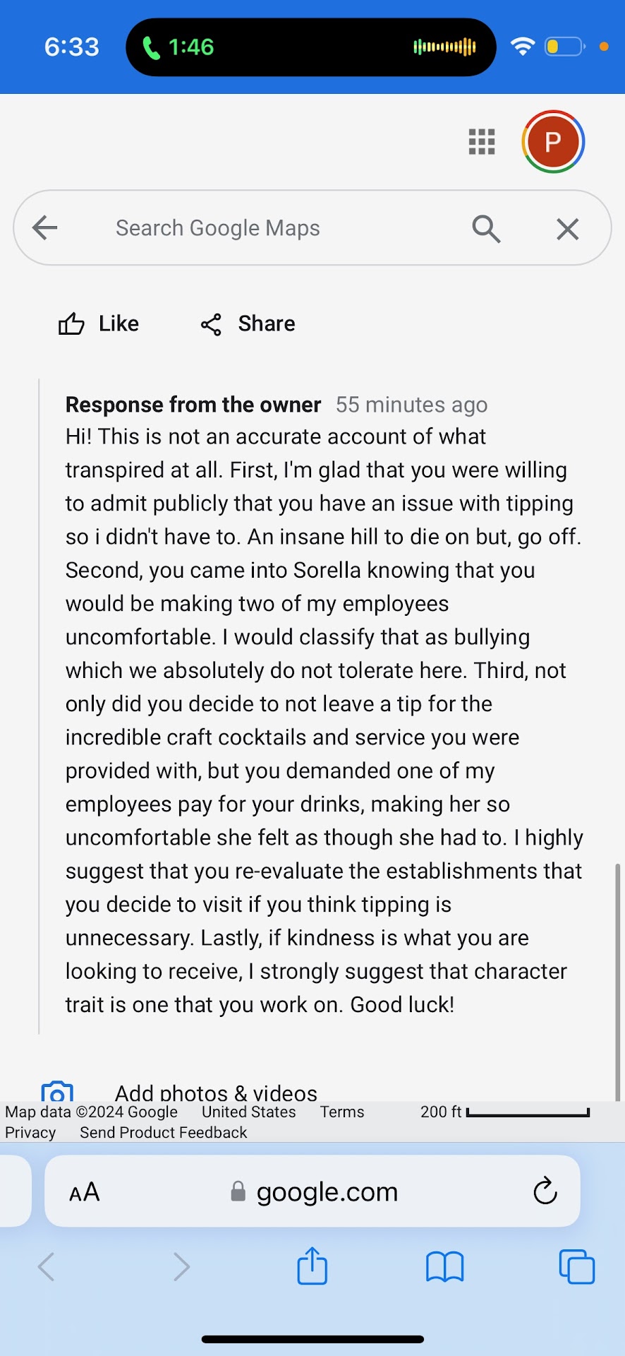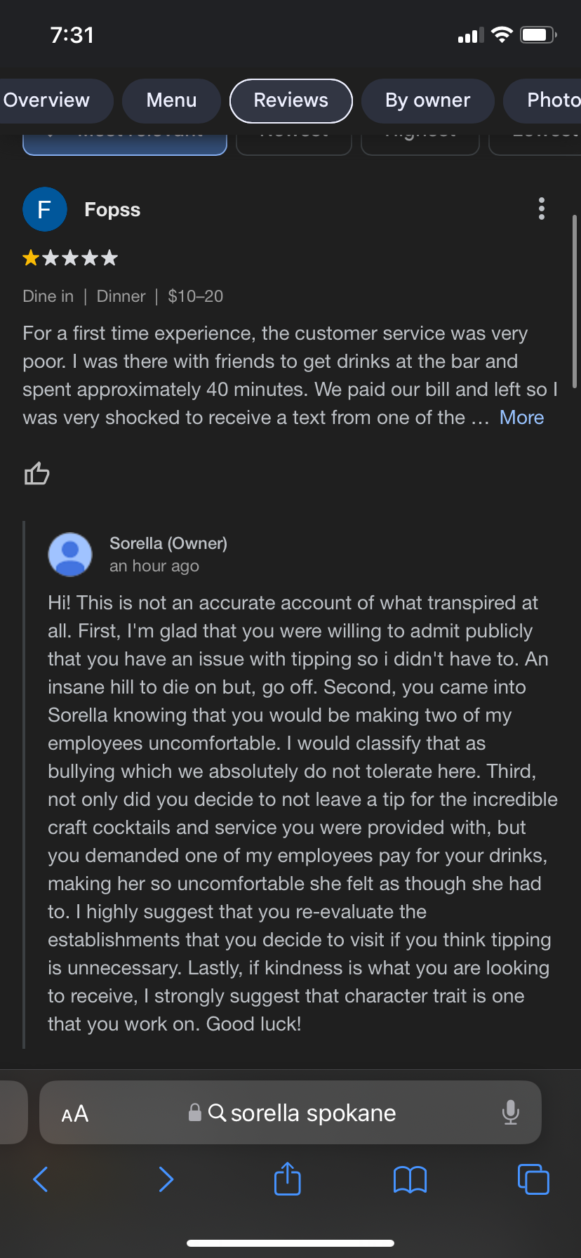 Lauren⌠Lauren⌠LaurenâŚFirst off I would like to start by stating how unprofessional you are. I was invited to sorella by my friend (an employee) as a celebratory night cuz I just passed my nursing exam. I had two friends who work there. When we got there, one of my âfriendsâ was the host but when we came in, she just said âoh you guys should just walk to bar and sit thereâ and this was very dismissive and I felt very awkward and uncomfortable. My friends who came with me noticed this. Moving on, we had one drink each that night and also had other plans so we just stayed for around 30 min. My âfriendâ who invited me offered to buy me a drink to celebrate my big achievement and this was said wayyyyy before we came. I was going to pay but my friend said she was going to buy me a drink to celebrate and gave me her card and left. I feel weird using other peopleâs money and felt weird leaving a tip on her card cuz for me it just felt out of place to do that. I and my friends are not from this country and have a different cultural background. That being said tipping culture is not a part of our culture. Mind you coming in, we felt as though we were dismissed and coming from someone who I thought was my friend, that affected me even more. I reached out to my friend after the night curious about my interaction with the host coming in. She let me know the vibes were off that night and they werenât having a good night from the start. She also let me know that her boss (Lauren) pulled her and my other friend aside to let them know that we didnât tip and made them feel bad. When I saw this text, I was actually very apologetic and tried explaining our side to my friend but she didnât reply. I felt the need to reach out and explain to her what went on and the fact that walking in felt unwelcoming for us. I think they completely ignored the fact that we complained about their service but were so concerned about us not leaving a tip. My friend proceeded to let me know her mind and honestly I get where she was coming from seeing that her boss (Lauren) embarrassed her in front of her colleagues. Sadly her text came off as rude and the girls I came in with were offended by this. One of my friends had to come back to talk to the manager and give the tips($2) that Lauren so badly wanted to embarrass us over. If I am not satisfied with my service, I do not feel the need to tip, because I tip for a good service. I wasnât satisfied with my service. Lauren, since you have decided to come on here and state the inaccuracy of my friendsâ reviews, I have a couple things to say about how inaccurate your reply is. I donât like someone who lies. So one thing you are not going to do is lie that I forced one of your employees to pay for my drink. Donât try to lie your way out of a bad review. Next up, you talk about how we came in knowing we were going to make 2 of your employees uncomfortable. I have two questions for you. Were the said employees the people I considered my friends? And in what way did we make them uncomfortable? I feel as though that statement comes from a place of racial prejudice as I and the girls I came with are people of color. Seeing that you clearly canât take criticism well, I know you would be replying this with tackiness. Hereâs an advice for you: maybe when customers complain, it means thereâs something to be worked on in your establishment. Do not go lying to save yourself. Maybe apologize and try to see how you can work on a better service. Your behavior in general towards bad reviews can be seen as bullying (you literally came on here to spew lies against I and my friends. Thatâs defamation of character and Iâd classify that as bullying too). Do...