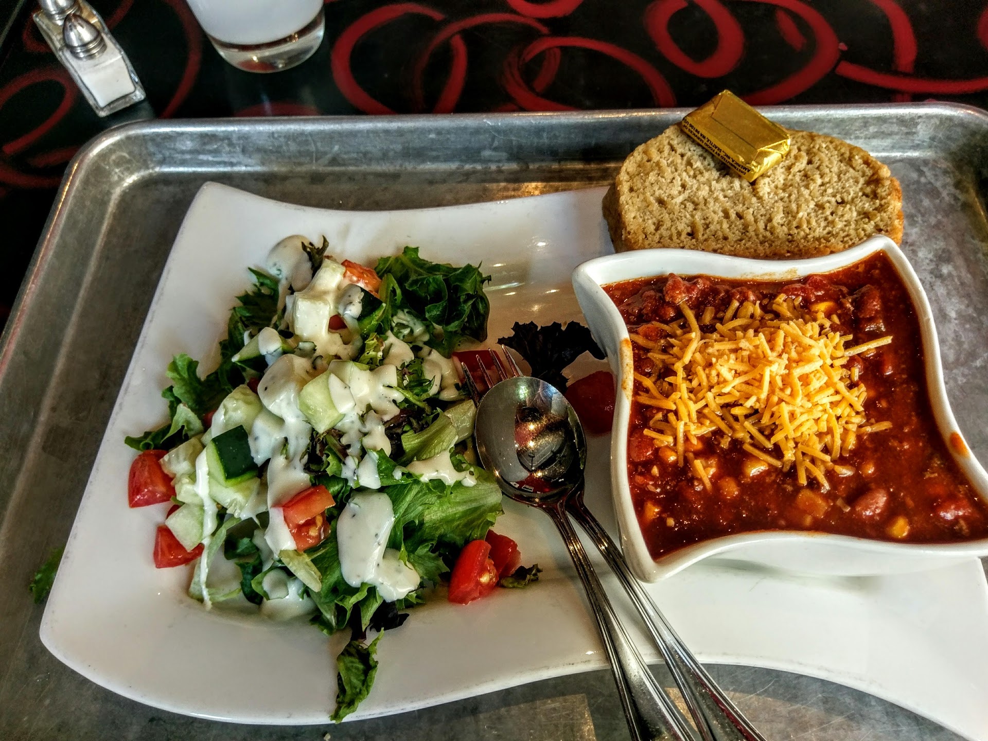 One of my favorites is the cheddar chicken soup. Thick, cheesy and slightly spicy, with big chunks of chicken and veggies. A dollop of sour cream that adds a cold creaminess to the hot spiciness. Matches perfectly with the beer bread,
