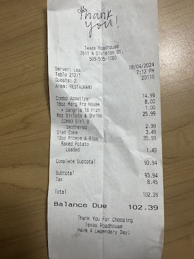 After waiting for my server to come back around 25 min I finally called him over and told him that I had gotten a sirloin not a rib eye. He went to the computer and said nope I rang in a sirloin. Understanding that he had misheard me when i ordered, I didn't want to argue with him as it's always fairly loud in there and he didnt hear me correctly.
