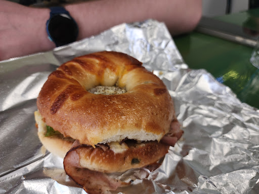 Read moreThe 3* is because they have one person working Sunday morning and it's super busy we were there for almost 2 hours most of which was waiting and while there several people left the line. We had never been so we stuck to it. The food though is really good just a bit greasy that gets soaked into the bagel. I had the Real McKoy and my husband got the Denver. We ate in shop and it was so loud with a constant line, we were almost done with our food when he got his hash brown. I got a rainbow road cereal bar which was pretty good, just very sweet; main complaint there is the staff member just threw at me from the shelf holding the cereal bars across the counter and cooking station to where there first table is on the left of the cash register area. We were going to get drinks while here but decided against it. We...