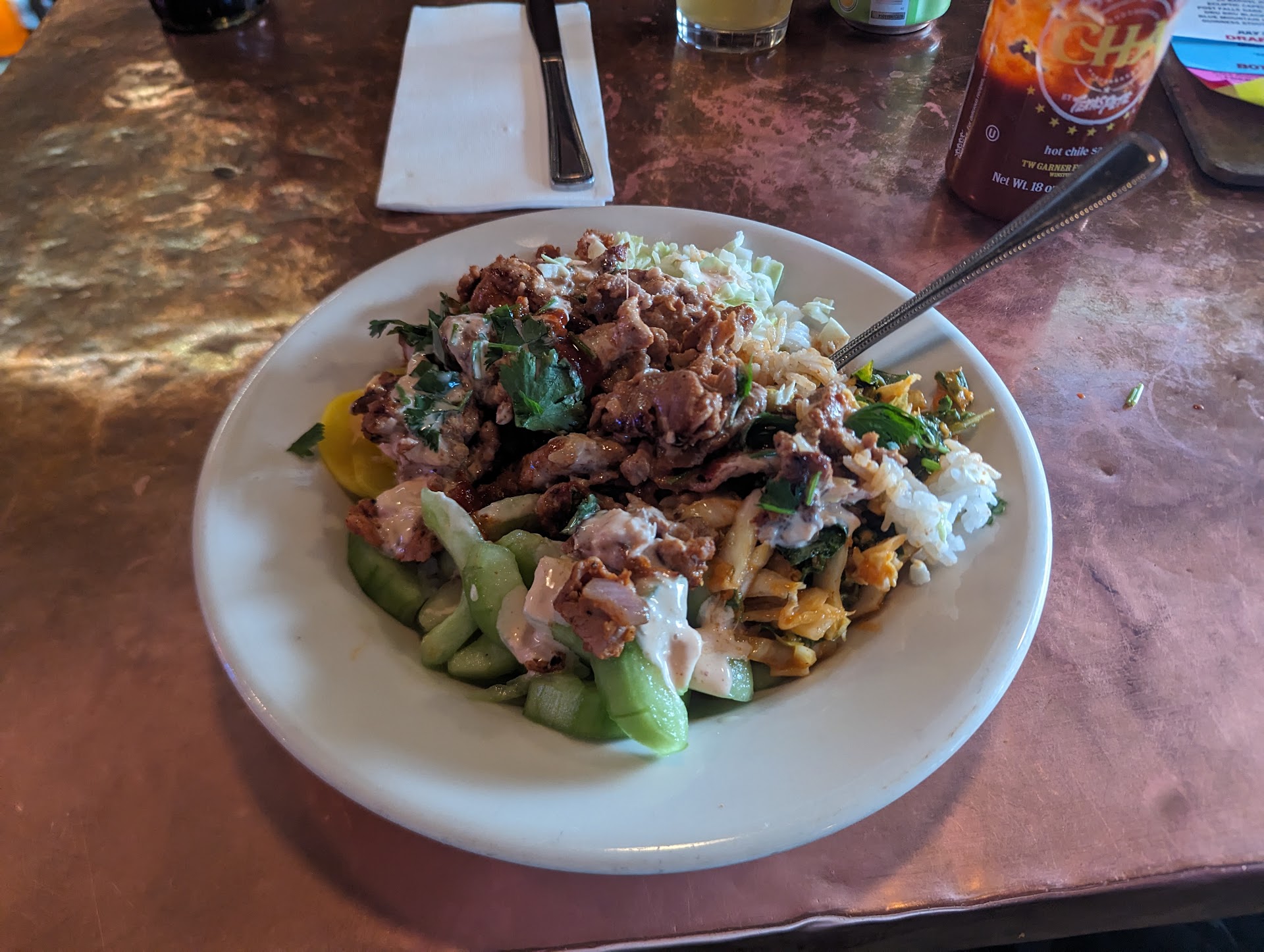 We walked in and was told it would be a 25-30 min wait to sit outside when there were 2-3 open tables. We decided to sit inside and it was fairly open. Great, it shouldn’t be too busy. Wrong. Took 10 minutes for anyone to show up and when our server shows up, he drops off a carafe of water and two glasses and walks off. Hmmmm, that’s odd. What’s your name, sir? 5 min later he arrives and drops off menus and walks away. 5 min later he arrives and what do you know, he speaks. “What drinks do you want?” When asked if a beverage is gluten-free, he says in a gruff voice, “it’s a seltzer.” Good thing he clarified that. Eye roll. 15-20 min later our drinks arrive and my can of seltzer became lonely without its glass. Again, he ghosted and came back 5-10 min later and took our order. Still don’t know his name nor haven’t received a greeting. 5-10 min later, I asked him for a pint glass and he responds, “for that?” pointing at my can. Uh, yes. He brings a dirty glass with chunks of food in it and I was done.