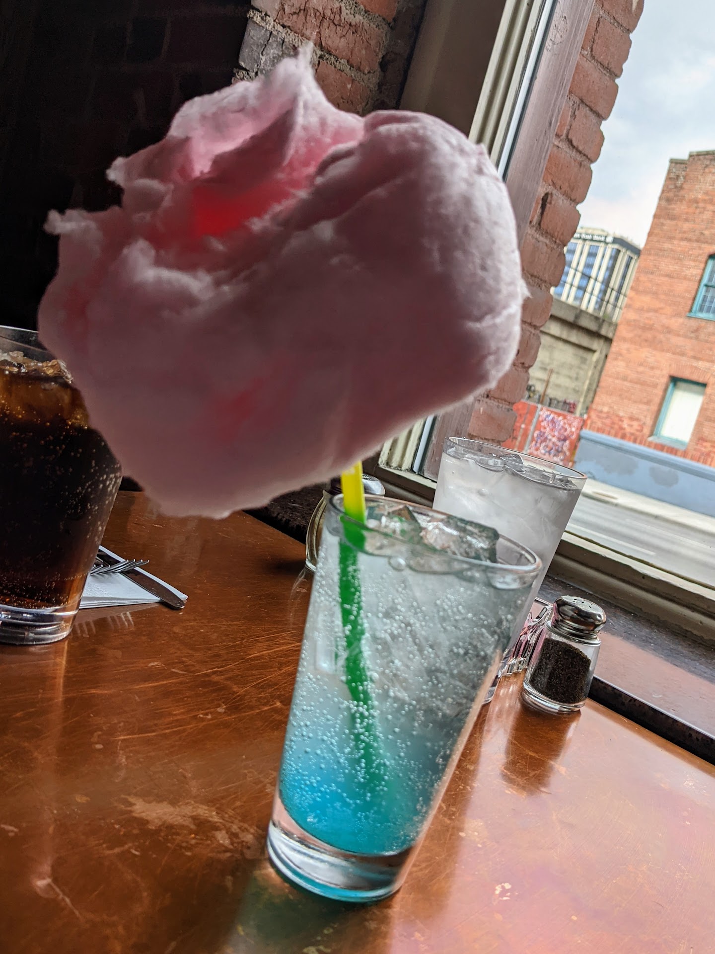 Our server, Scott, right away said he would be right back. After a few minutes of scanning the menu, Scott returned to take it drink order and thanked us for our patience. Since cotton candy is my fav, I couldn't resist not ordering the Cotton Candy Limeade. It arrived with cotton candy on a stick, which I wasn't expecting and loved it! The limeade itself was really delicious and not too sour. My friend ordered a vanilla Italian Soda and liked it so much he ordered a 2nd one, which was perfect because now we both have souvenir glasses. Scott was awesome enough to give us two fresh clean glasses to take home.