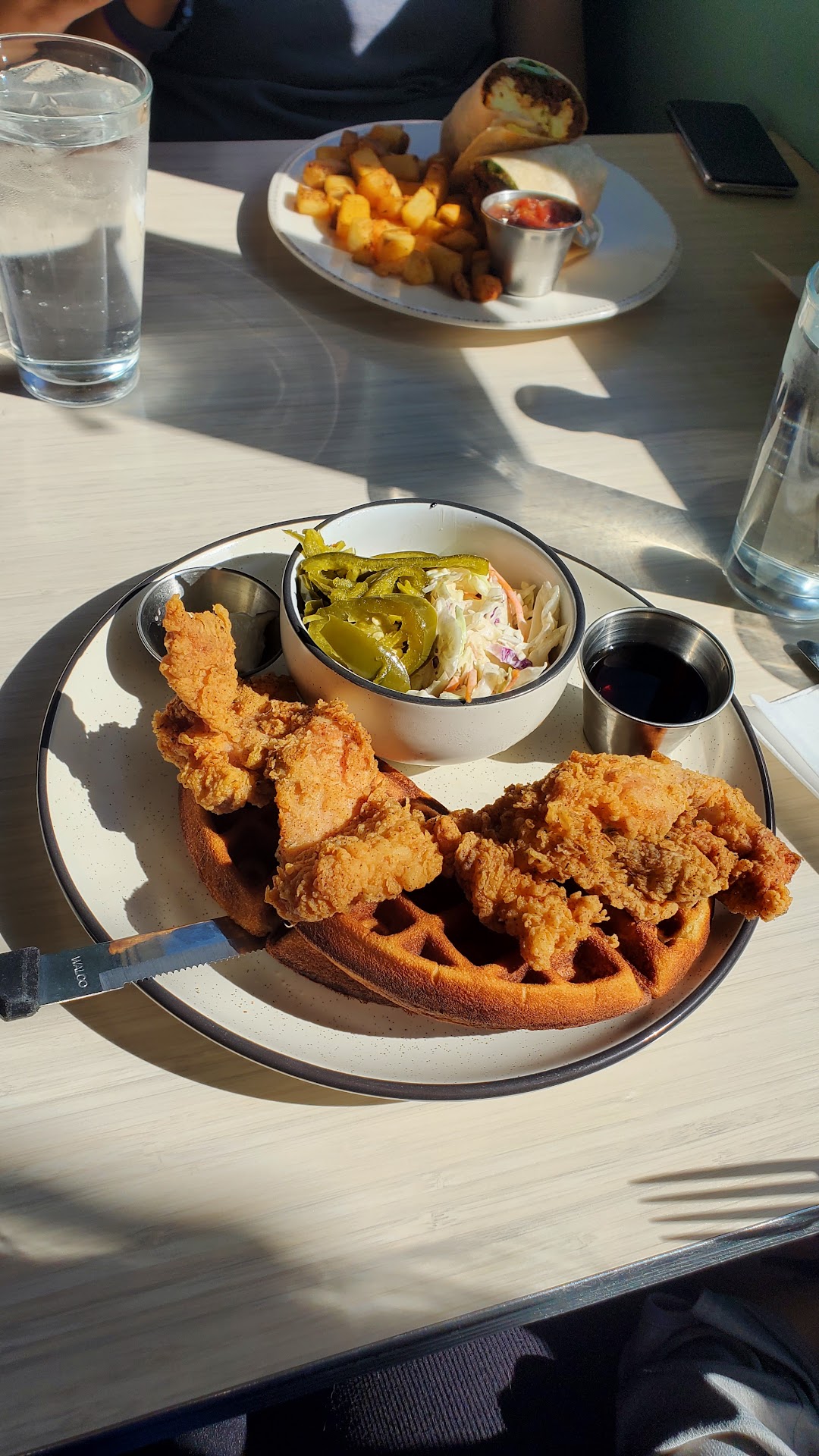 Items Ordered: Bacon-Maple Waffle Country Fried NY Strip n’ Eggs (sub Chicken)