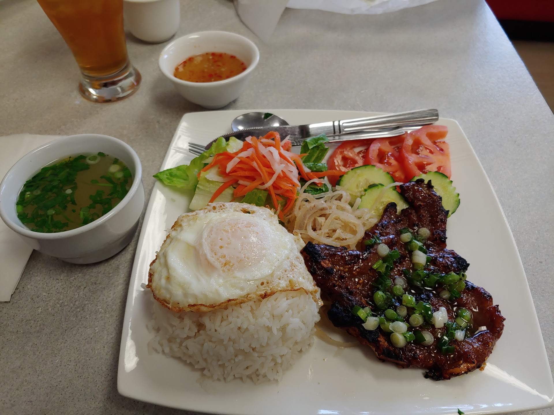 The building is a run down place that looks like it was an old Burger King back in the 70's... The counter was walled up and nothing else done. We went in for lunch and tried the lunch special menu. The food seemed like last nights reheated stuff from the weekend. ( It was Sunday. ) It was dry and stringy chicken smothered in gravey for the almond chicken. The sweet and sour was the same cut up chicken patty with different sauce. The chow main, for some reason had a slight seafood aroma that skewed the taste a bit. It was "okay"....The fried rice was soft but tasted bland so I poured some left over egg flour soup on it to doctor it up. ( Hot & sour was not an option available for lunch. ) We requested hot tea and got a chipped tea pot with one green tea bag. There was an extra charge. $30 w/ tip. ( She worked hard and was pleasant. ) To be fair other reviews said the Pho was good. Traditional Asian though.....Not so much. My wife does not want to go back. It was our 1st. visit on a whim. The good news was....Everything else that day by comparison was a step up so.....( The bar was pretty low. ) Our mood was...