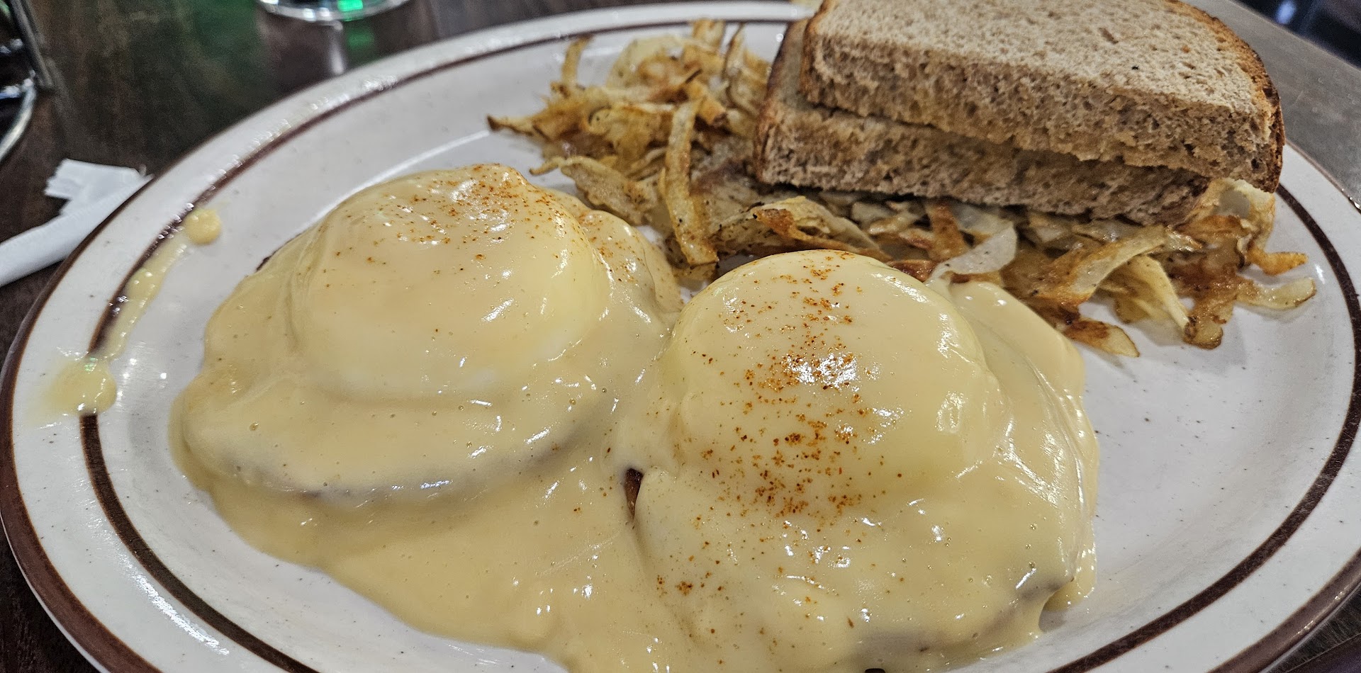 A hard pass for us. The over-peppered hashbrowns were crunchy on the top, but they weren't done on the inside. I thought maybe some ketchup would help, but there was something seriously wrong with it. I can't quite put my finger on what it was, but I used my napkin to wipe it off my tongue and then brushed my teeth and tongue when I got home. The untoasted toast was cold and saturated all the way through with liquid margarine. I CAN say the eggs were cooked to specification and the bacon was okay. Out of the whole plate of food, I ate the eggs, a piece of bacon, a bite of the toast and a couple bites of the hashbrowns. Normally I would take it home and doctor it up, but I wasn't interested in trying. No one checked on us after we got our food. The waitress waited until she brought the bill before she asked how things were (she apparently didn't notice my mostly untouched plate pushed to the end of the table). I said it wasn't very good and she replied, "Well, there's always something else to try next time!" No, "I'm sorry you didn't like it. What was it you didn't like? Is there something else you would like instead?" Just handed us the bill and proceeded to tell us about all the specials we should come back for. Maybe they're better at lunch and dinner? I'm not willing...