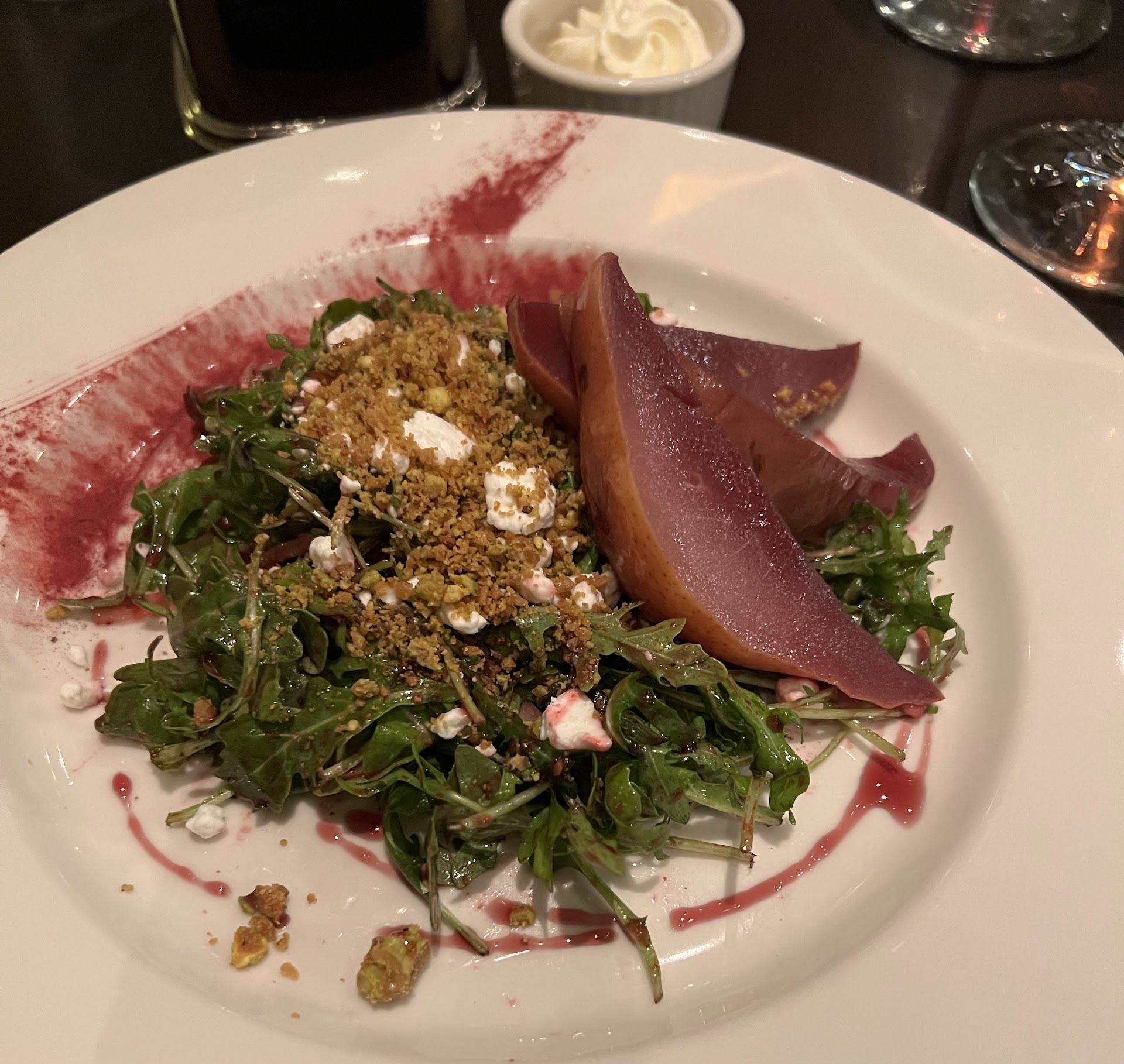 We had an early dinner before a concert and were seated immediately. We jumped right into the cocktail menu. Both drinks were excellent, though my partner’s could’ve been a touch colder—maybe 10 more seconds of shaking. But the flavor was spot-on, so no big deal. My chosen drink was a play on a French 75, and very drinkable. The perfect aperitif, with a touch of Creme de Violette. The right amount to interest the palate without taking over the flavor.