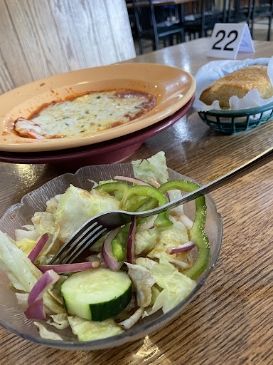 My wife got the meat ravioli with a salad & garlic bread, which she said was good! And I had the calzone. It was very good! It was not as spicy and seasoned as I would like, and I would have cooked it a bit longer (just to crisp it up a bit), but it was PACKED with fillings/toppings. The red pepper flakes took care of the spice & we really enjoyed ourselves.