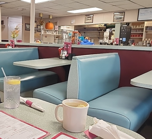 Quaint atmosphere with old-time, classic diner feel. Loved the vinyl teal booths, ice cream parlor/coffee counter, and simple decor of framed, nostalgic, hometown sports team pictures (B&W). The staff were very friendly and responsive. Food was served fast and hot. Bathrooms and diner were bright and clean.