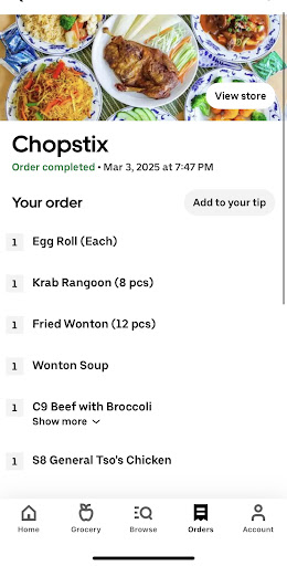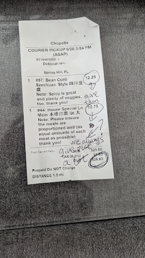 Read moreTo write ANY thing on a customer receipt aside from THANK YOU FOR YOUR ORDER! is unacceptable, especially when you're Clearly Mocking my order!! Ordered lunch items directly from CHOPSTIX website, and made small note requests as reflected on the attached receipt. The staff here decided to be condescending and disrespectful and write unnecessary responses on the receipt. The food had zero seasoning, last I checked and ate Szechuan style is Spicy... My dish was bland. Also this dish is listed as served with tofu, carrots, onions, zucchini and broccoli yet there were peas, mushrooms, water chestnuts that were highly undesired but since they weren't listed I was forced to deal with them. House special lo mein is also not worth it. I don't venture here often, in fact this was my second visit, and due to the snarky comments from the unimpressive staff along with the lack of flavor, you can bet I will not be returning! Whoever took the time to support this low grade establishment and staff by responding needs a lesson on etiquette. I do not care how You feel about your portions, because you are not paying for anything! Your "generous portions" were NOT requested, and you come with more dismissals by saying "use HOT SAUCE at home." You are shameful and your poorly thought response just lost you...