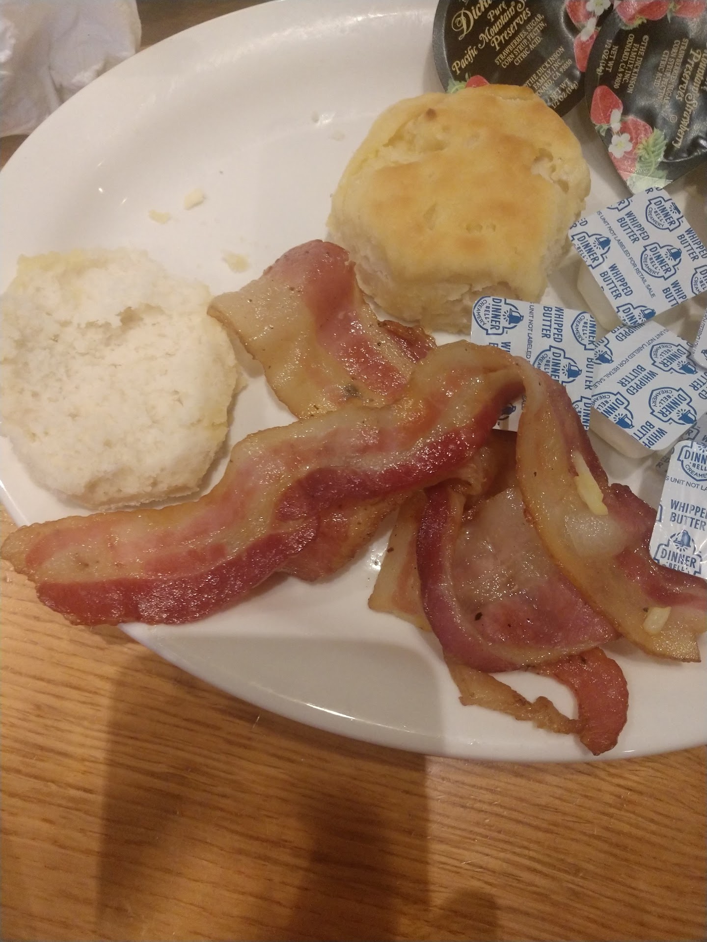 Our food was mediocre at best. Our grits were very watery. The grits, eggs, and gravy were bland and unseasoned. The ham was very salty. Thereâs no more glass bottles of maple syrup, you now get regular syrup in a plastic lidded ramekin. The typical dish of butter a jam they used to give you by default with your biscuits is only available on request. Many of the sides that came by default have to be ordered at additional cost now and that 3 pancake stack is now 2. Silverware we got in a paper bag instead of usual napkin were very spotted with mineral deposits and water spots. I know where we live the water is very hard but the last visit we had here a few years ago never yielded silverware that looked like this. I asked for a second set and they looked the same.