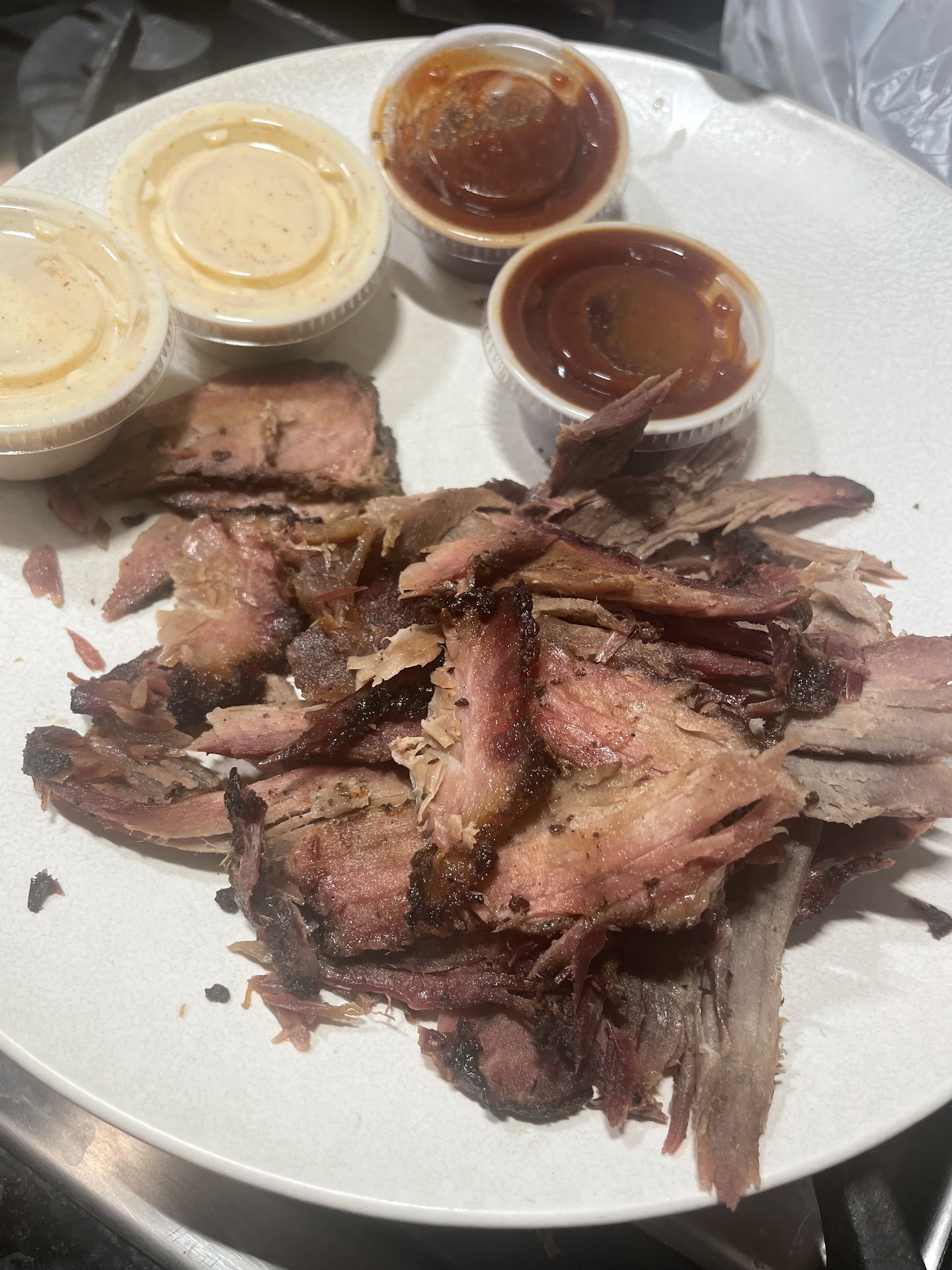 Read moreShould have read the reviews prior to stopping in the empty establishment. Upon opening the door.. the smell of dirty mop water and No aroma of BBQ should have been a fast turn around and back out the door experience. But no.. I gave it the benefit of the doubt and totally disregarded 3 red flags (Empty, Smells rotten, no food smells) to trying over priced.. microwaved food. I tried the tasteless beef jerky.. I mean what they called Brisket that had no flavor and was dried out beyond what BBQ sauce could help. Sides were lukewarm. Cheesy potatoes tasteless.. Mac n cheese from a velvetta box.. green beans and greens had a little flavor but still fresh out of a can/refrigerator and microwave a tad. What a...