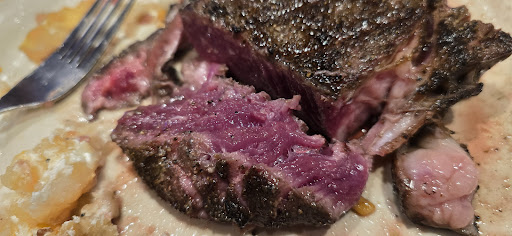 Talk about a dry spot and out of this world service. Not in a good way. My friend and I decided to give it a shot, and for my first experience, it will be my last. The place was empty when it should have been packed. 1st sign. We were seated quickly. The service was super slow. We sat at the bar area at a high top. People on both sides were complaining when we got there about no silverware. Meanwhile, we waited about 10 minutes for the server to show up. We proceed to order, and this guy is just lost. I always order a Pittsburgh steak. I do have to say, the cook hooked it up. Sadly, the 18oz ribeye was tough and tasted like salt. Being cooked this way, it's hard to find a tough steak. I also ordered the caesar and loaded baked potato with no sour cream. I'm pretty sure it had extra and no butter when I got it. The lad was obviously lost, so I just let it be.