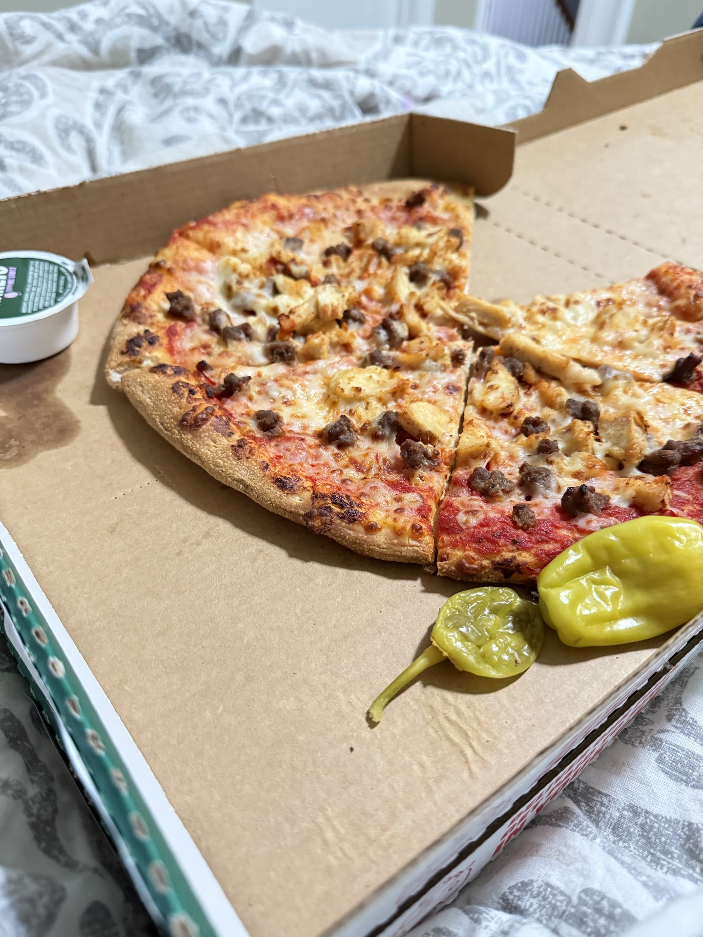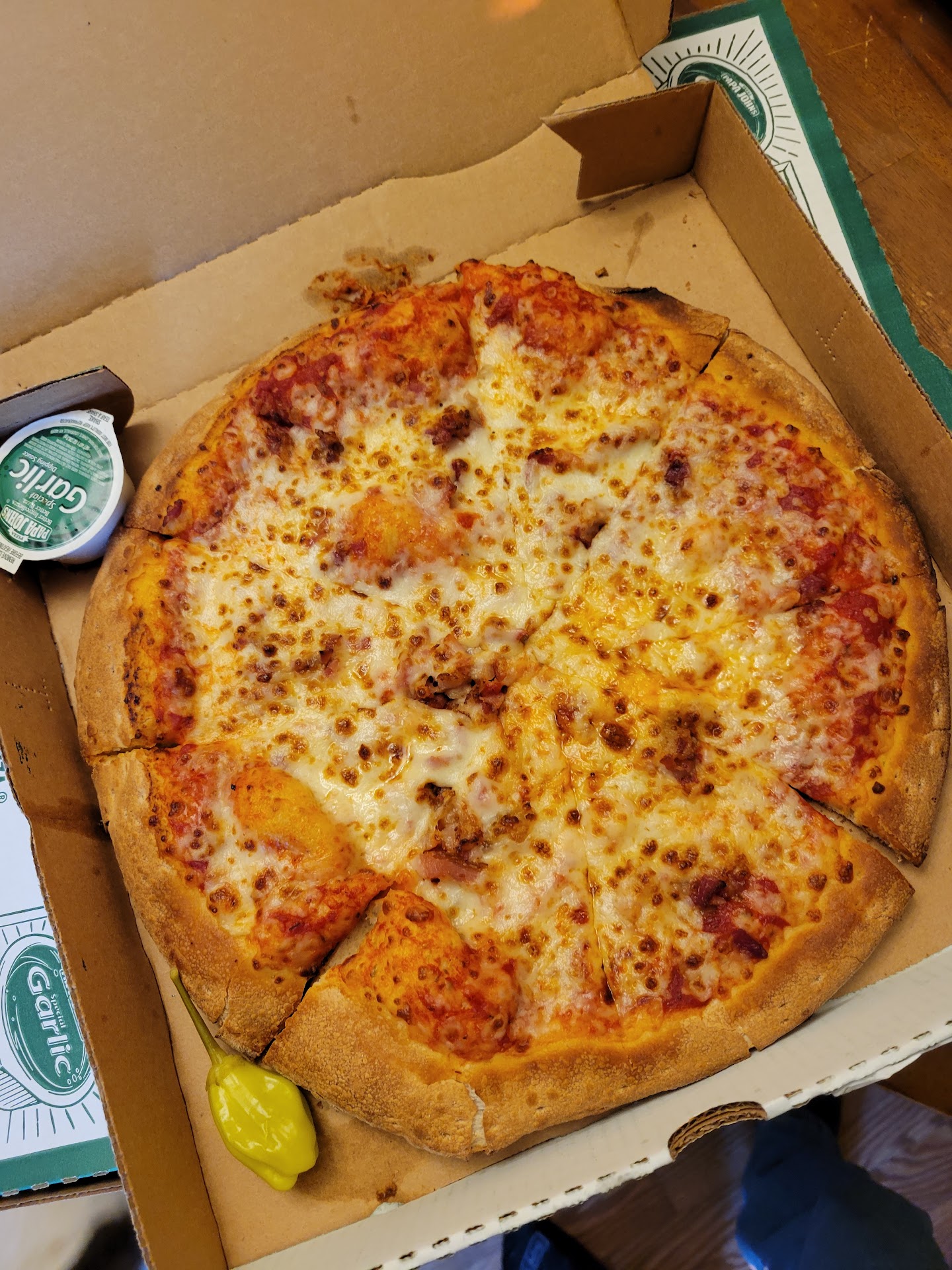 This evening is the last time I buy Papa John's pizza from this location. I just returned from picking up my online order on a late Saturday evening. As I was waiting for my pizzas, there was a young lady in plain sight casually vaping where they prep the pizzas! There were other employees around working and talking with her, and they didn't even bat an eye, which makes me think this is a common occurrence.