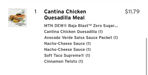 Read moreI double checked my mobile order before posting this review (see photo) I ordered a Baja Blast Mountain Dew ZERO. I have multiple health conditions that prevent me from being able to have full sugar soda. I got my order and started drinking it when I got home, and got VERY sick. I tested my drink and it is NOT diet. A blood sugar monitor can determine if a soda is sugar or diet, my tester showed it was full sugar. This soda is almost impossible to tell the difference between diet and regular. I want to emphasize how important it is that y’all don’t mess this up. This is like saying something is gluten free and then giving them something with gluten. I expect a sugar free soda when I order one, I should not have to stress about if it’s correct. It’s ridiculous that I have to test my soda to make sure I don’t get sick. We ordered Taco Bell in celebration of my husband’s birthday (Taco Bell is his fav), his birthday was instead spent taking care of me the rest of the evening because I got so sick from this...