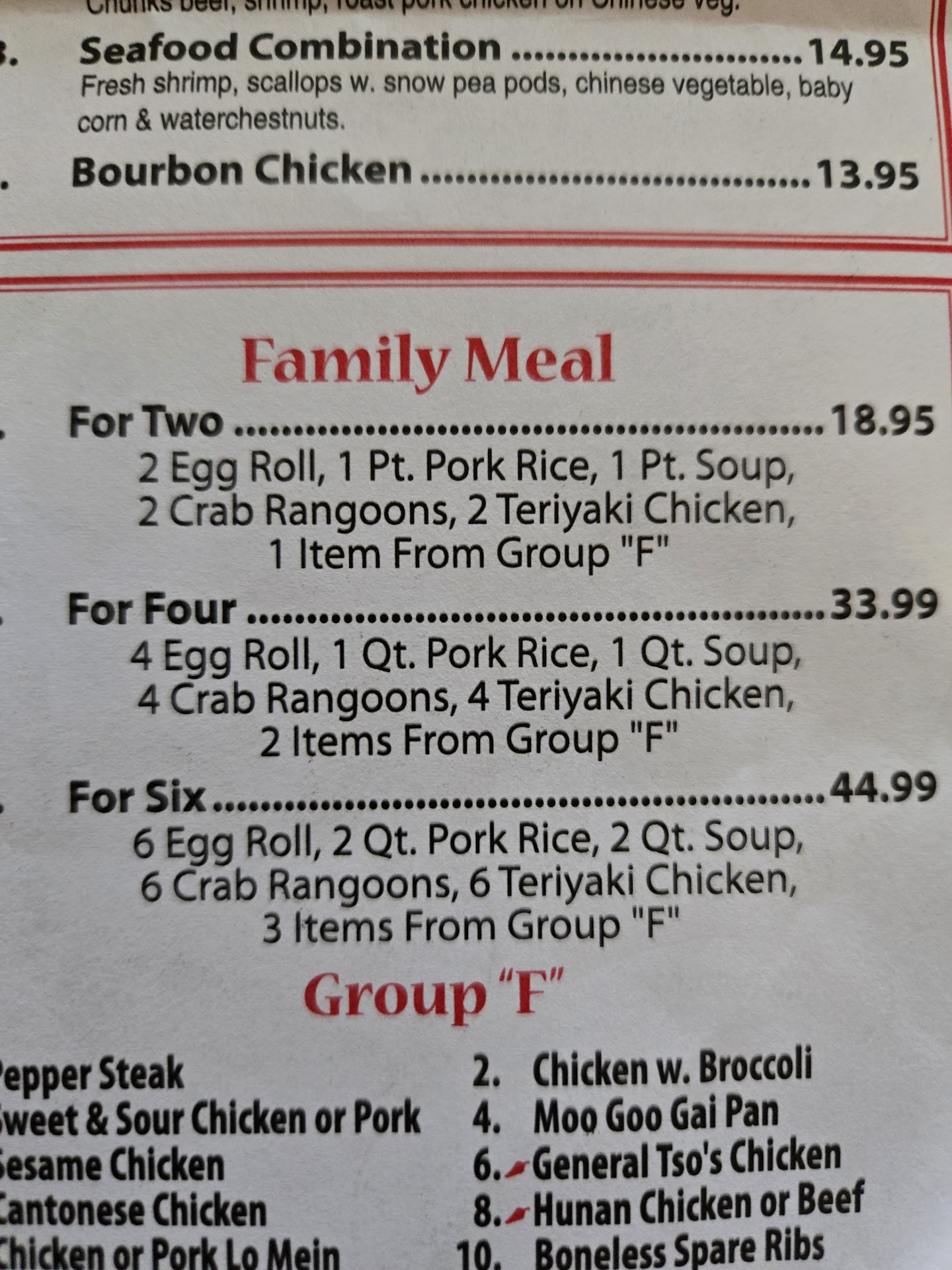 I ordered the Family Meal for 4. This includes "4 Egg Roll, 1 Qt Pork Rice, 1 Qt Soup, 4 Crab Rangoon, 4 Teriyaki Chicken, 2 Items from Group F" (a selection on entrees). I asked for Shrimp Egg Rolls which are the same price on the menu, Lo Mein rather than Rice which I knew was an upcharge and a quart of Hot & Sour Soup.