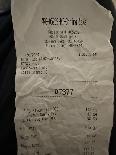 Went in ordered Togo. I ordered a half pound roast beef crinkle fries and a roast beef slider. Small drink came with it. The clerk said oh I am going to give you a larger fry because you had to wait. Watch the sandwich get put in a bag and asked if that was a 1/2 pound she said no I put in a double. I said I ordered a 1/2 pound and she changed it but as she was headed to fryer says I just give you the fries you paid for and dumped the others in the trash. That was fine with me I didn't want all those fries in the first place. But she acted as though I was trying to get away with something and that is not a good thing. It is one of the reasons we stopped going to that Arby's. Unfriendly staff and people that serve the public and don't pay attention. Started out as a good experience finish as a bad one that will .ake it another 6 months before I return. I almost didn't go because of what we have been through in the past. We have had all ki.ds of problem at that store. Things like no signature items. No roast beef a few times and no turnovers. On several occasions have asked for crinkle fries get curly ones, I get the French dip a lot but at that store they never give you the au gue, even if you ask did you out it un there they will say yes and then we leave and it is not there that has happened at least 5 times in the past. There has been so many mistakes from the staff I would rather goto McDonald's. Then when you say something they come back with attitude and disrespect. Thank you for at least looking at this like in past. I don't see it changing for the better it has been over a year and half and nothing changes. See you again in...