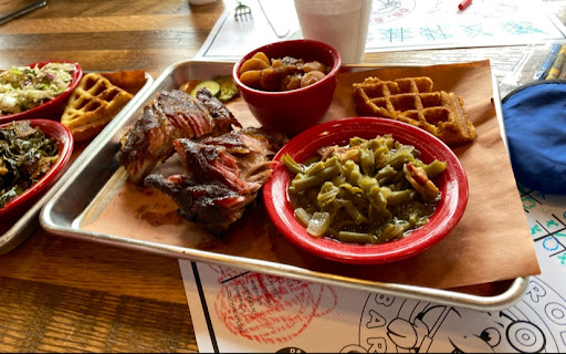 I ordered the 3 meats and 2 sides ($25). I chose Pulled Pork, Brisket, and Beef Polish Sausage for my meats. For my sides I got Butter Beads and Fried Apples! It also came with Cornbread Waffle. For a drink I got the Draft Root Beer ($2 each). Everything was Outstanding. My taste buds threw a rager! Everything was tender, everything had it own unique and wonderful taste. I don't really know what makes them butter beans, but where have you been my whole life. The Root Beer was top notch, easily worth the price. Also the sauces I tried were Original, Peach Apricot, and Blueberry or Blackberry. The were all very liquid, aka not thick at all. I really liked them all. Sauce isn't needed, but it really does enhance the meats. The cornbread Waffle was the best cornbread I've ever had also, and the Honey butter just plain is heaven on top.